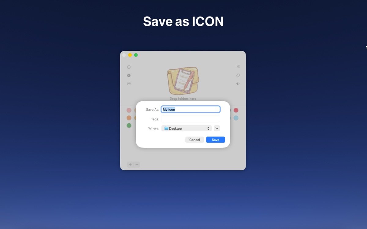 "I thought I could shortcut creating my custom colored folders with a real program on the new computer, but unfortunately, it generated new folders with ".icns" after the names and giant file sizes (1.2 to 1.5MBs each!) I don't want to bog down my new hardrive with empty folders bigger than their contents!"