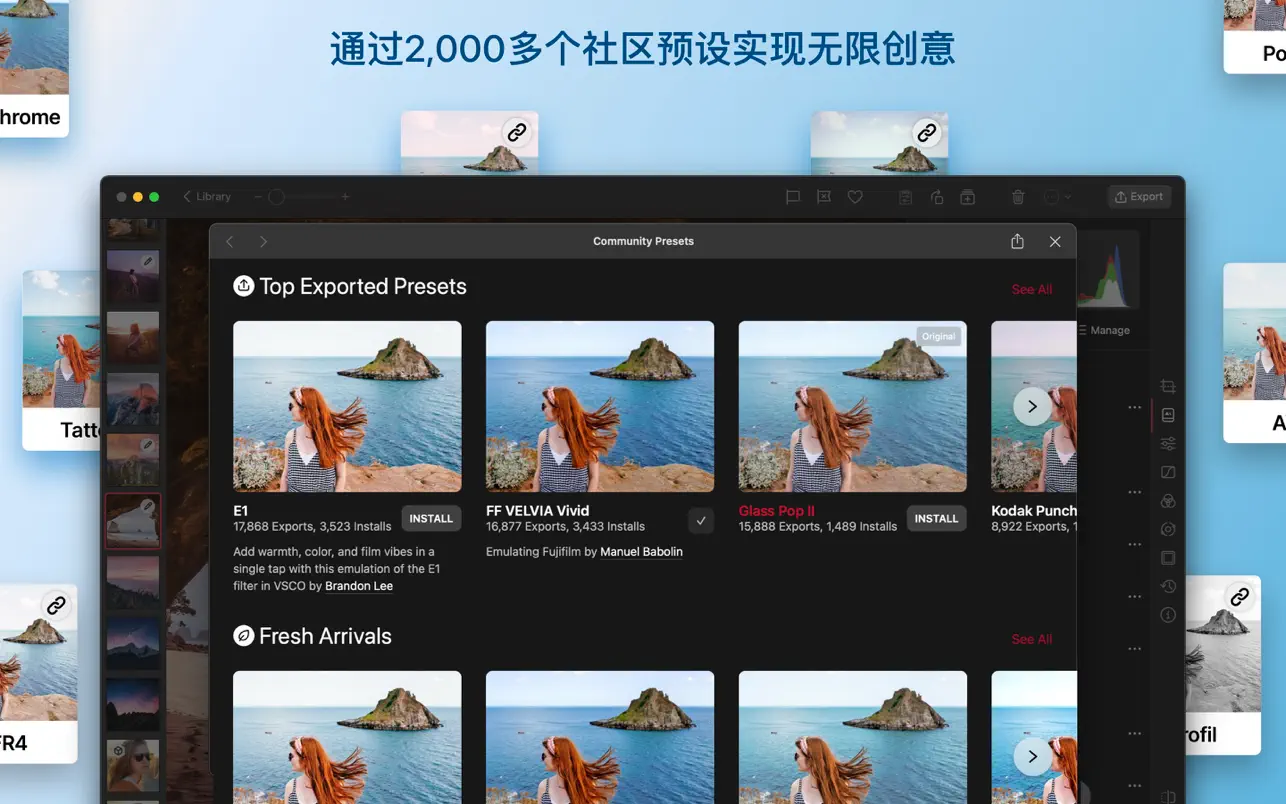 4. 预设管理和分享:内置社区预设库,用户可创建自定义滤镜,批量应用并通过链接分享,跨设备同步无缝衔接。
