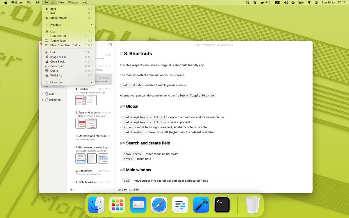 FSNotes for Mac 是一款专为macOS和iOS设计的现代笔记管理器,以Markdown编辑为核心,强调纯文本文件存储和开放格式支持。用户可以轻松创建、编辑和组织笔记,所有内容以纯文本形式保存,确保数据长期可读性和兼容性。这款笔记管理工具运行流畅,即使处理上万文件也能保持高效性能。通过iCloud Drive或Dropbox同步,用户可在MacBook和iPhone间无缝切换笔记。FSNotes笔记管理注重隐私,提供加密容器和Touch ID锁定功能,适合需要安全笔记管理的专业人士和日常用户。其键盘中心设计灵感来源于Notational Velocity,结合弹性双窗格视图和暗黑模式,提升了笔记编辑的舒适度和效率。作为开源项目,FSNotes文本编辑器支持外部编辑器集成,变化实时同步到界面,确保笔记管理过程顺畅无阻。