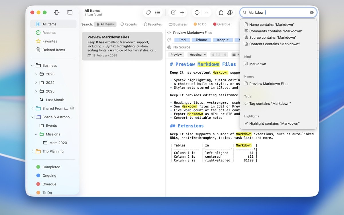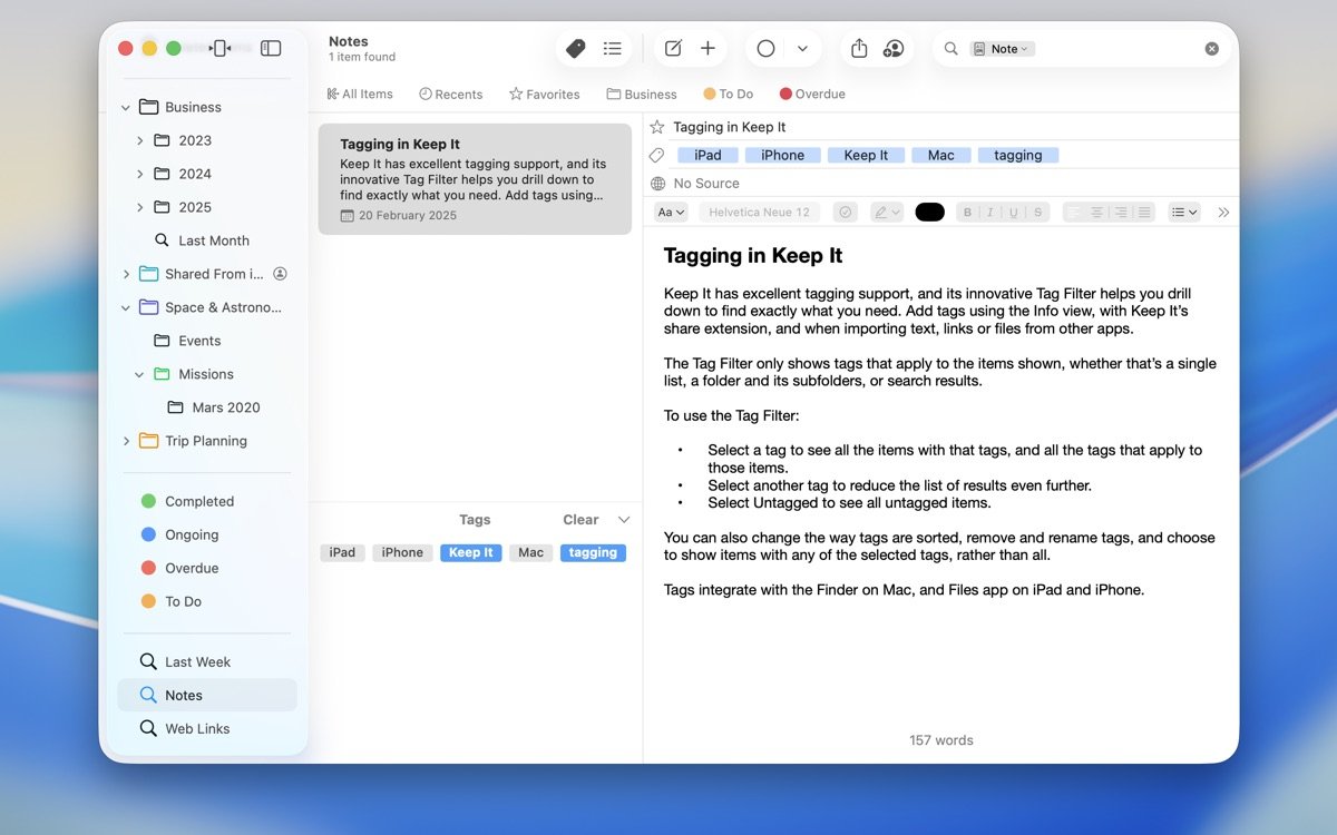 Keep It for Mac 于 2017 年由 Reinvented Software 推出初始 1.0 版本,当时它以创新的笔记与组织结合方式迅速获得关注,填补了 Mac 平台上类似应用的空白。随后,开发者持续迭代,2018 年引入 iOS 版本,实现跨设备协作。2020 年左右的更新聚焦 Catalina 兼容性,添加网页缩略图和 AppleScript 支持,进一步增强自动化功能。进入 2.0 时代,该应用迎来重大升级,包括 Finder 深度集成、Quick Open 快速导航和改进的搜索算法,这些变化让它从简单笔记工具演变为全面文档中心。截至 2025 年,Keep It 已发布 2.7.7 版本,累计用户反馈超过数万条,持续优化以适应 macOS 新特性,如 Sonoma 和 Tahoe 的界面适配,保持其在笔记管理领域的领先地位。