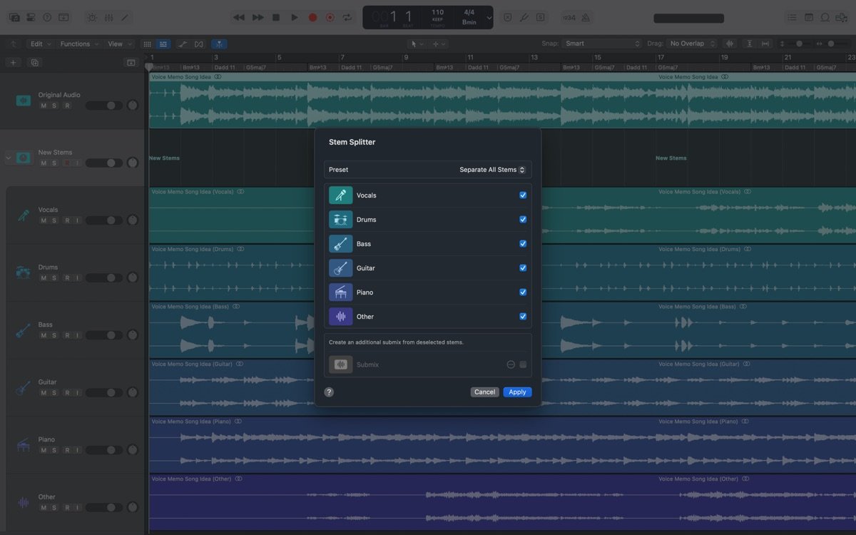 2. Stem Splitter:智能分离音频轨道,将声音拆分为鼓、贝斯、人声、吉他、钢琴和其他元素,便于独立编辑和重混。