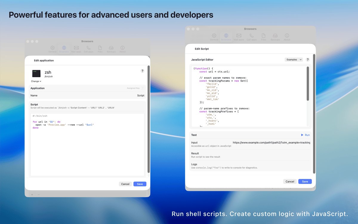4. 规则自动化设置:基于域名、文件路径或按键修饰符创建规则,实现特定链接文件自动路由到预设应用,结合 JavaScript 脚本扩展高级匹配逻辑。