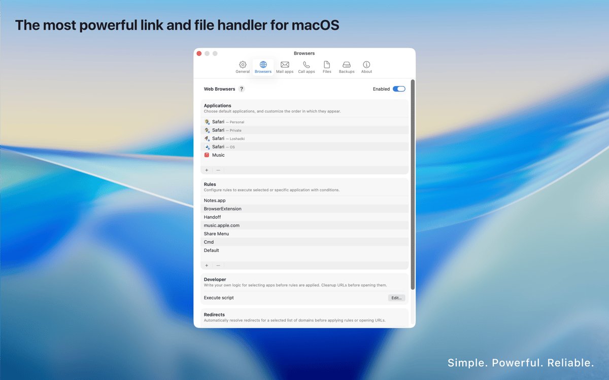 OpenIn for Mac 自 2021 年初推出以来,不断演进以适应 macOS 更新和用户需求。最初作为免费工具发布,专注于浏览器和邮件链接管理,迅速在 Reddit 和 Mac 社区获得认可。2022 年进入 Mac App Store,推出付费 Pro 版本,支持更多文件类型和规则自定义。2023 年集成 Setapp 订阅服务,优化了沙盒限制问题,并引入 OpenIn Helper 辅助工具,提升浏览器配置文件兼容性。2024 年版本 4.0 带来重大界面重构和 JavaScript 脚本支持,允许高级用户编写自定义规则。进入 2025 年,随着 macOS 15.1 的最低要求,4.3 系列版本进一步强化域名匹配和图标自定义功能。目前已服务数万用户,累计更新超过 20 个主要版本,开发者持续响应反馈,推动从简单选择器向智能自动化工具转型。