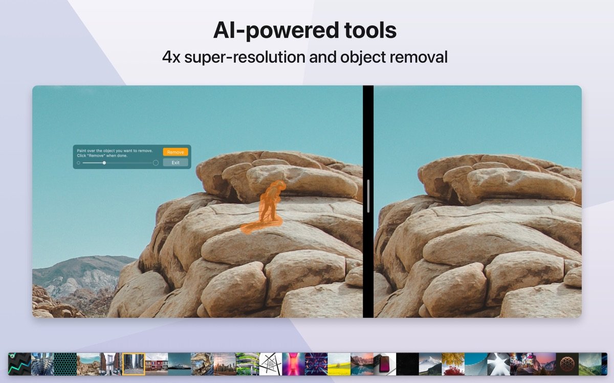 5. AI 增强功能:对象移除工具通过刷子笔触智能重建背景,超级分辨率实现 2x/4x 上采样,保持细节清晰,适用于 macOS Ventura 及更高版本。