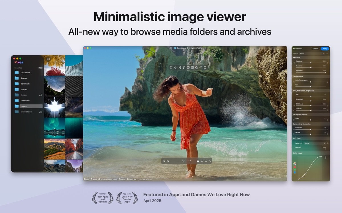 Pixea for Mac 于 2020 年初次推出版本 1.3,迅速因其轻量级设计和多格式支持获得认可。此后,开发者持续迭代优化,2023 年 2 月的 6.1 版本带来重大更新,包括增强的图像切换速度和稳定性修复,标志着其从简单查看器向综合媒体工具转型。2024 年 9 月的 7.0 版本适配 macOS Tahoe 系统,引入 Liquid Glass 主题和新 UI 自定义选项,进一步提升用户体验。进入 2025 年,7.1 版本添加过滤、排序和元数据支持后,8.0 版本于 12 月发布,成为迄今最大规模更新,聚焦批量编辑和精炼编辑界面,推动 Pixea 在 macOS 生态中稳居图像管理领域的领先地位。通过这些演进,Pixea 从一款基础图像浏览器成长为功能丰富的媒体管理平台,累计 App Store 评价超过 5000 条,平均 4.7 分。