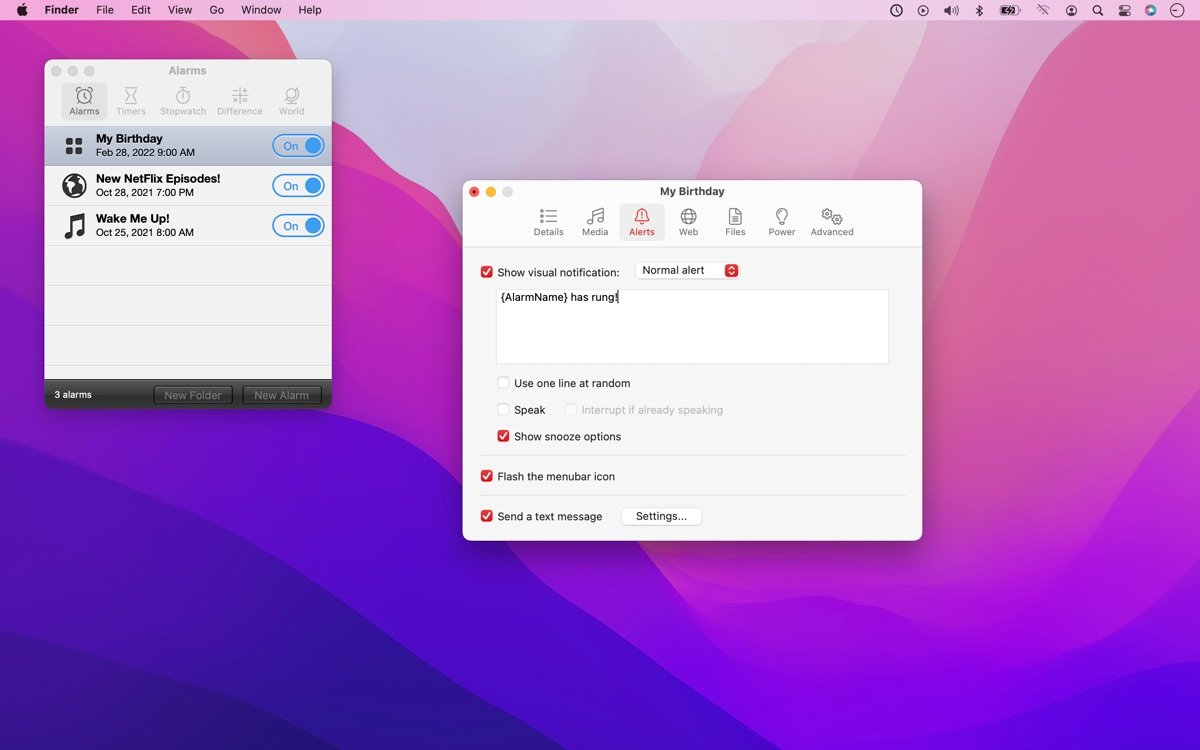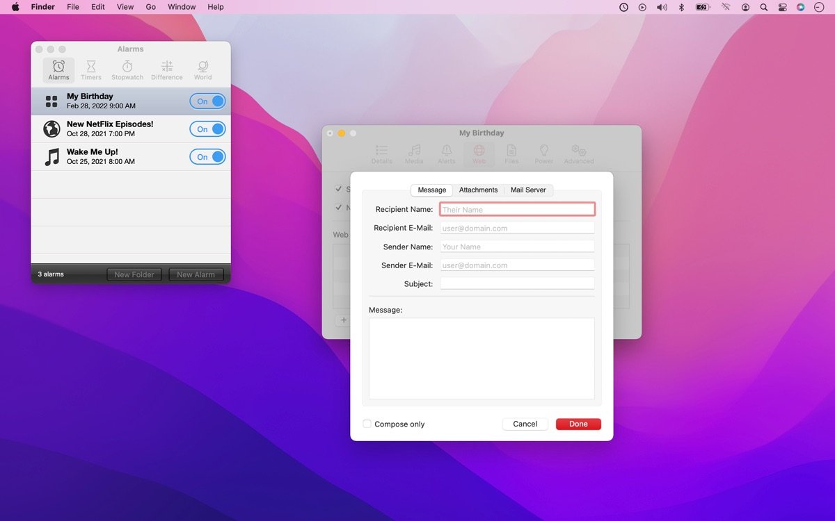 Alarm Clock Pro for Mac 是一款经典的多平台闹钟应用,专为 macOS 用户设计,能将你的 Mac 转变为智能生活助手。它不仅仅是简单的时间提醒工具,还集成苹果音乐播放、互联网广播和自动化任务执行,帮助你从喧闹的日常噪音中苏醒,开启宁静的一天。无论早晨叫醒播放喜欢的歌单,还是工作间隙发送提醒邮件、监控屏幕活动,这款软件都能无缝融入你的生活节奏。支持 macOS Big Sur 及更高版本,兼容 Intel 和 Apple Silicon 处理器,提供流畅的 Retina 显示体验,让时间管理变得轻松而有趣。
