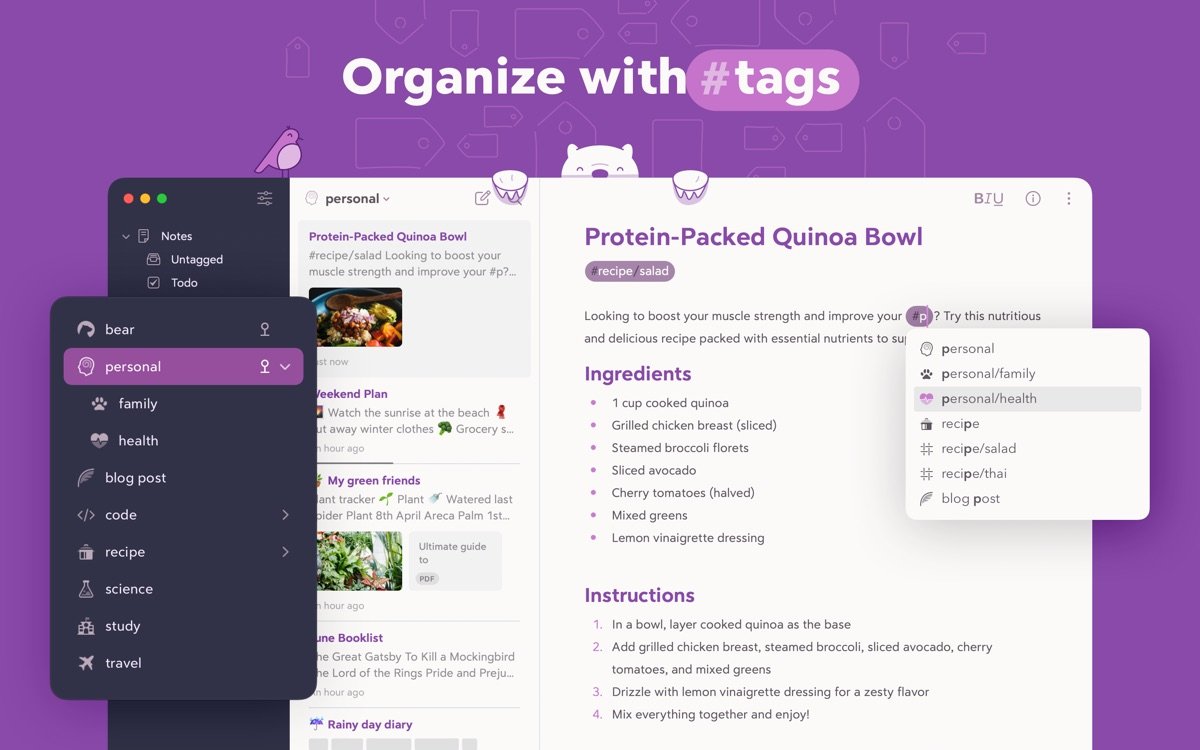 Bear for Mac 是一款专注于Markdown笔记的强大应用,以简洁界面和高效功能著称。它支持无缝整合文本、图片、表格和待办事项,让用户轻松捕捉灵感、组织生活。无论是日常写作、任务规划还是构建个人知识库,Bear for Mac 都能提供流畅体验。通过灵活标签系统,用户可快速分类笔记,实现高效检索。Bear for Mac 强调隐私保护,笔记仅存储在用户设备和iCloud中,支持可选加密,确保数据安全。作为Markdown笔记领域的佼佼者,Bear for Mac 兼容多种设备,帮助用户随时随地管理信息,提升生产力。