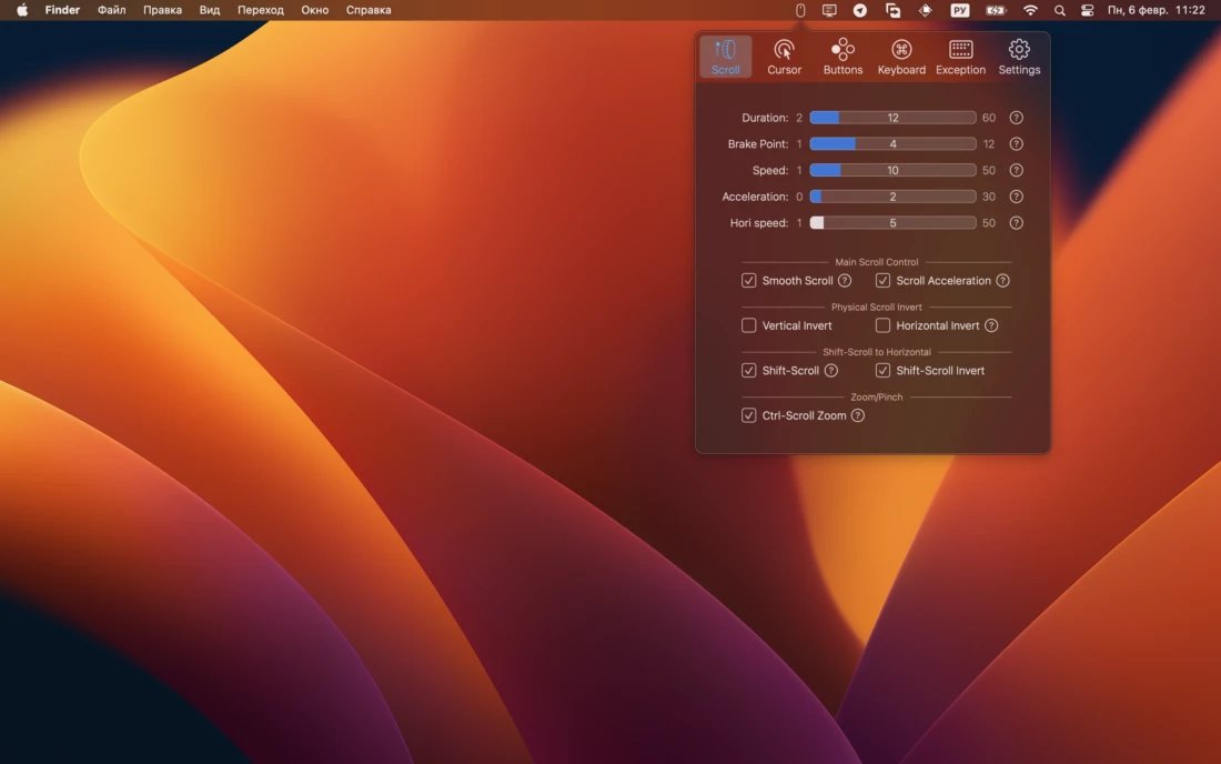 1. 顺滑鼠标滚动配置,包括持续时间方向加速和离散模式,支持修饰键横向滚动缩放和速度调节。
