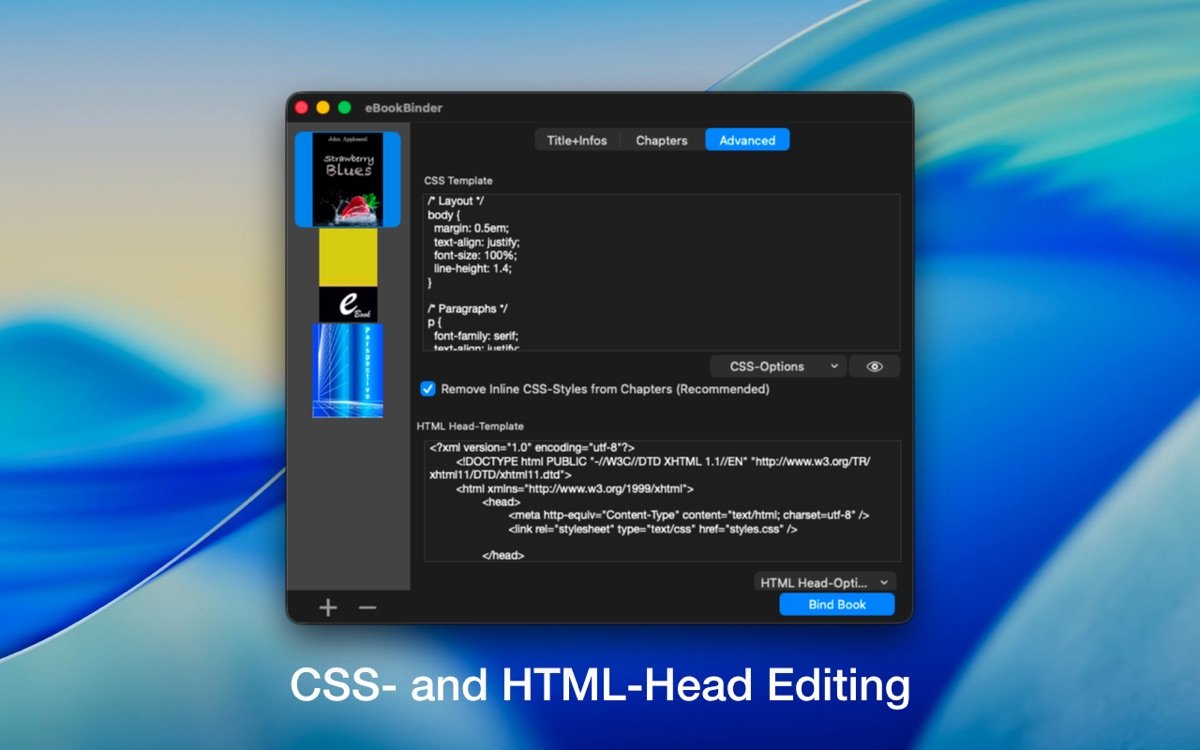 6. 高级选项允许自定义HTML头和CSS样式,导入无DRM EPUB文件编辑,实现个性化EPUB电子书设计。