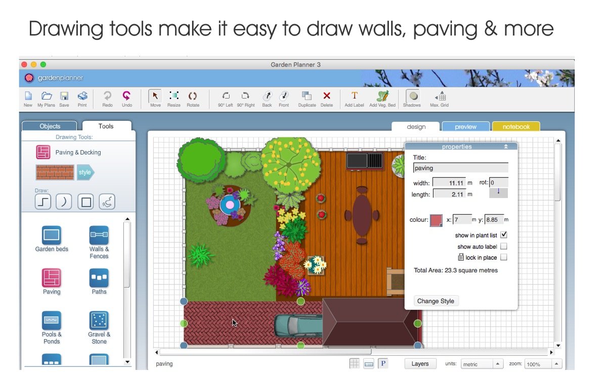 6. 蔬菜床工具和自定义铺装,专为园艺规划提供精确测量和纹理导入。