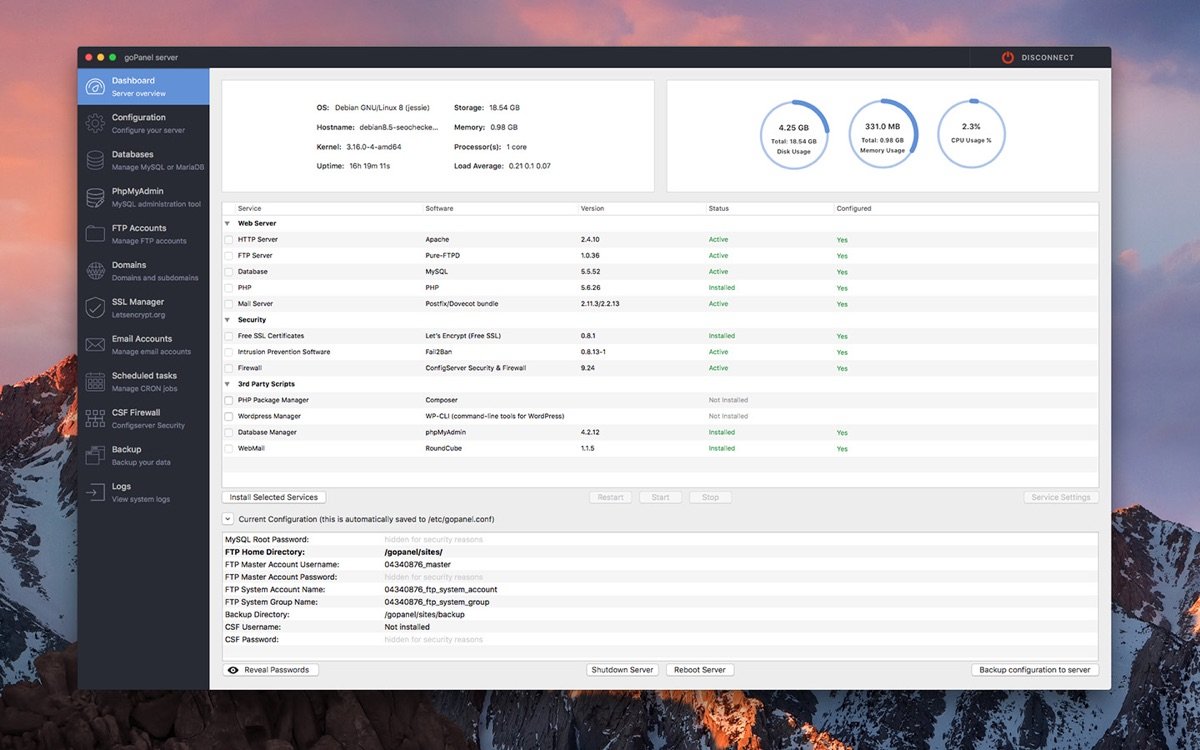 goPanel 2 for Mac 是一款专为Mac用户设计的Linux服务器管理工具,它通过简洁直观的界面,让网页托管变得轻松高效。无需在服务器上安装额外软件,所有凭证安全存储在本地Mac上,确保数据隐私。goPanel 2 支持无限服务器管理,涵盖Apache或Nginx网页服务器配置、PHP多版本切换、MySQL或MariaDB数据库创建、FTP账户设置、免费Let's Encrypt SSL证书申请以及邮件服务器部署。无论是新手还是资深管理员,都能快速上手,实现服务器优化和网页托管自动化,提升整体工作效率。goPanel 2 强调用户友好设计,结合强大功能,帮助节省时间和成本,成为网页托管领域的可靠伙伴。
