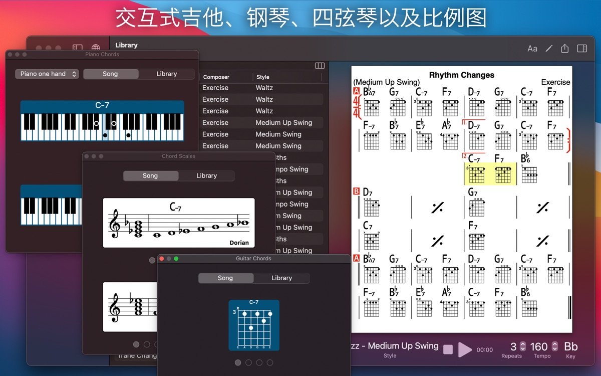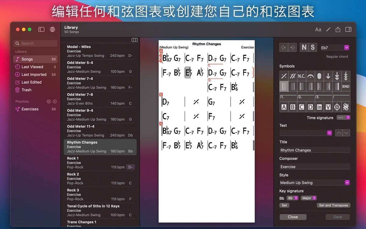 iReal Pro for Mac 是一款专为音乐家设计的伴奏练习软件,它模拟真实乐队伴奏,让用户在练习时感受到专业级别的音乐支持。这款音乐练习工具支持创建和编辑和弦图表,适用于吉他、钢琴、贝斯等多种乐器,帮助音乐爱好者随时练习爵士、摇滚、拉丁等多样风格。无论是初学者还是资深音乐家,iReal Pro for Mac 都能提供个性化音乐伴奏体验,提升演奏技巧和即兴能力。通过iReal Pro for Mac,用户可以轻松下载海量歌曲图表,并在伴奏中录音自评,真正实现音乐练习的智能化和便捷化。作为一款备受音乐学校青睐的软件,它已被伯克利音乐学院等机构广泛采用。