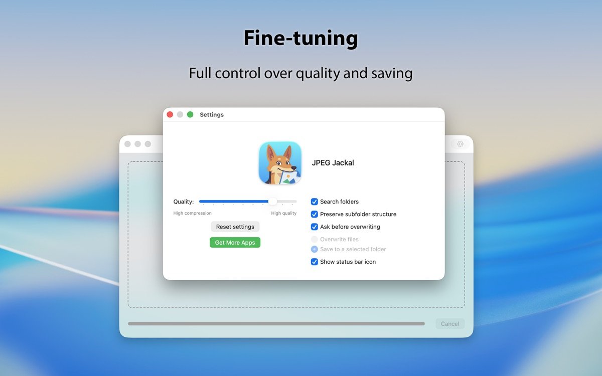 JPEG Jackal for Mac 于2016年首次推出,初始版本聚焦于基础压缩功能。随后在2.0版本中引入了EXIF信息保留和拖拽处理改进,提升了用户体验。2020年左右的更新添加了界面优化和bug修复。2023年2.1版本实现了对Apple Silicon的兼容,进一步提高了性能。直至2026年推出的3.0版本,软件进行了全面 redesign,融入现代界面设计,并优化了与最新macOS的兼容性,使其在图像压缩领域保持竞争力。