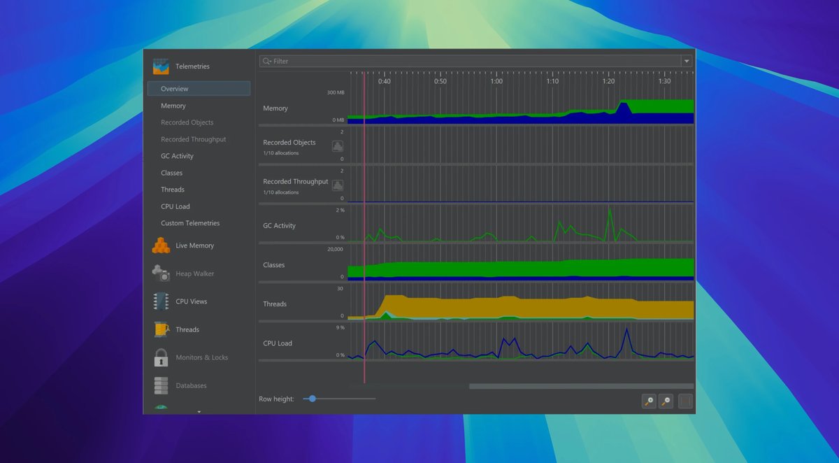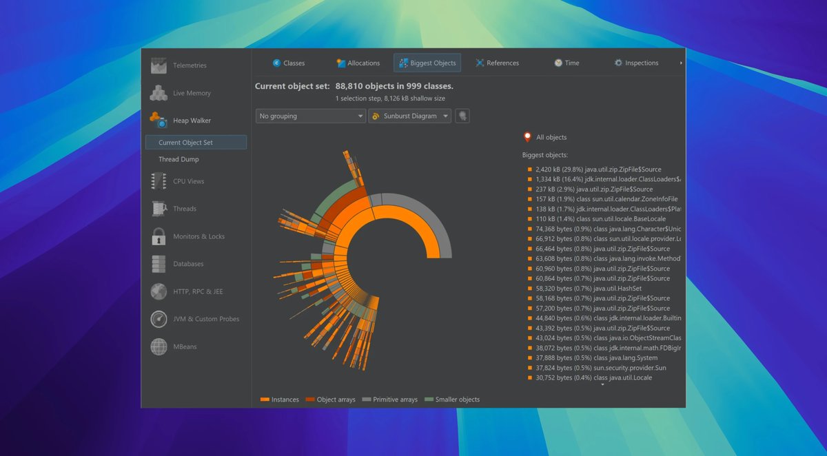 2. 内存监控:内置堆行走器分析分配和泄漏,支持HPROF和JFR快照导入,精确追踪对象生命周期。