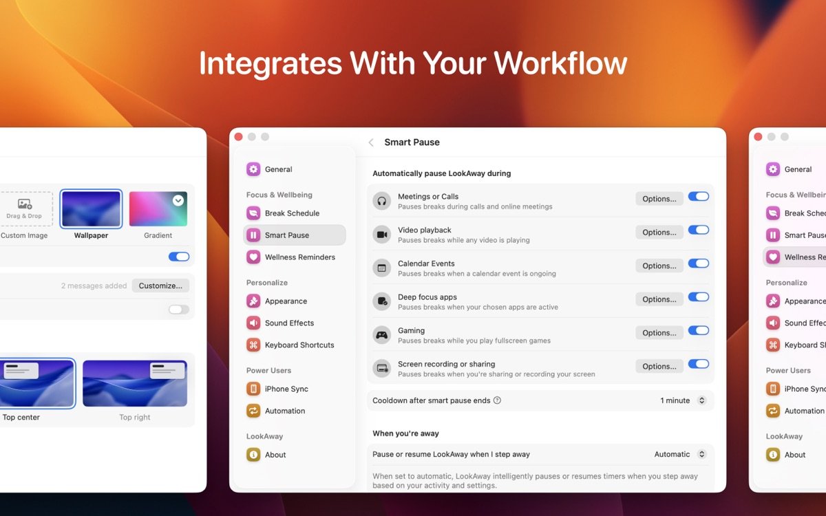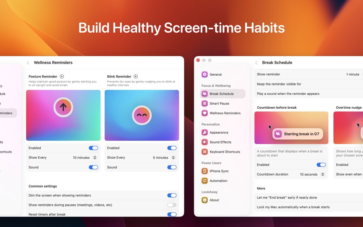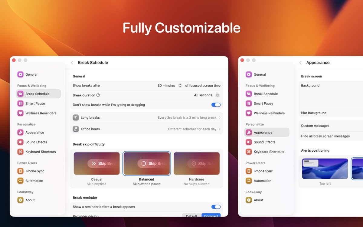 5. 跨设备同步与个性化:和iPhone/iPad上的LookAway Mirror同步,休息时自动帮你屏蔽分心应用;还能自定义声音、背景图片、消息内容,支持Shortcuts和AppleScript,低资源占用几乎不占CPU。