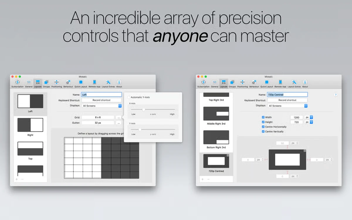 Mosaic for Mac 是一款高效的窗口管理工具,专为 macOS 用户设计,帮助优化桌面布局和窗口管理。通过简单拖拽,用户可以快速调整窗口大小和位置,实现无缝多任务处理。无论是编程开发、设计创作还是日常办公,Mosaic 都能提升生产力,让窗口管理变得直观便捷。软件集成 macOS 原生功能,支持自定义布局和多显示器环境,确保窗口布局稳定有序。作为窗口管理领域的佼佼者,Mosaic 强调用户体验,提供多种激活模式如拖拽到屏幕顶部或按住选项键,方便快速应用布局优化。