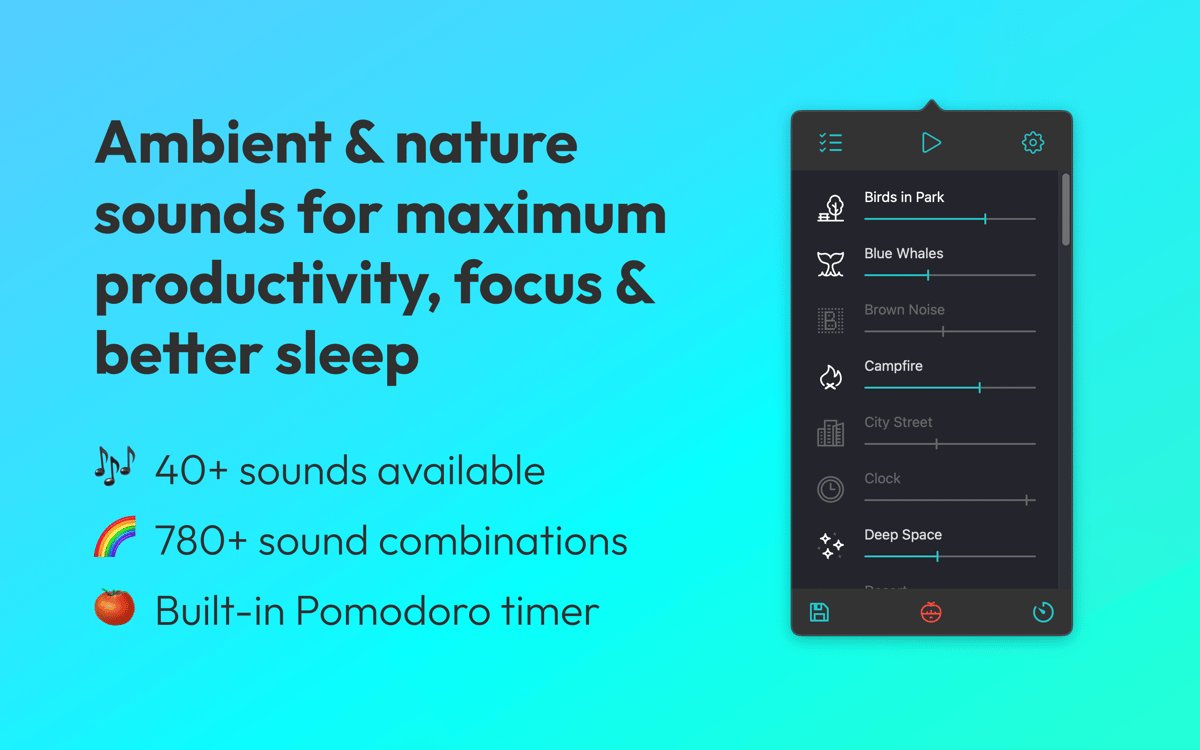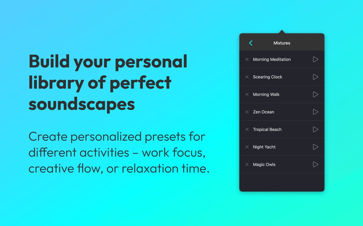Noizio for Mac 是一款专为 Mac 用户设计的环境音播放器,它通过提供丰富的自然声音和白噪音,帮助人们在喧闹的环境中保持专注、放松身心或快速入眠。这款应用以简洁的设计和高质量的音频资源为核心,让用户轻松创建个性化的声音氛围,无论是办公室工作、学习复习还是家庭休息,都能有效屏蔽干扰,提升生活品质。作为一款环境音播放工具,Noizio for Mac 强调无缝循环播放和背景运行功能,确保用户在多任务操作时不受影响。其内置的多种声音选项涵盖了自然景观和日常场景,让白噪音生成变得简单而高效。