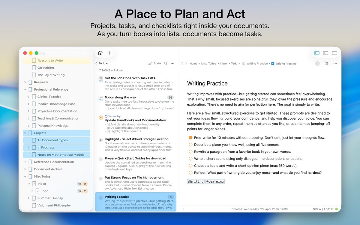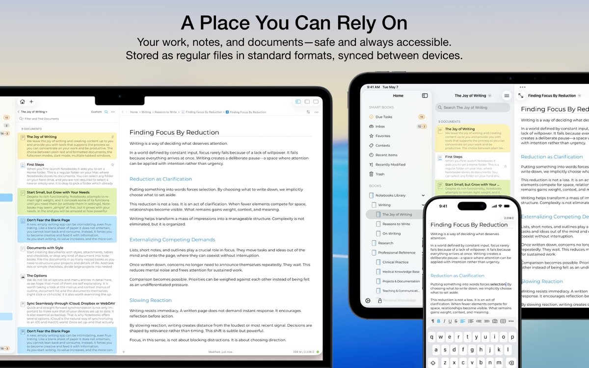 Notebooks for Mac 是一款专为专注写作和长期思考而设计的Mac应用。它不仅仅是简单的笔记工具,还集成了文本编辑、Markdown支持、文件整理和任务管理等多项功能。用户可以自由地在纯文本、Markdown或富文本格式之间切换,嵌入图片、PDF和各种媒体文件。所有文档都以标准文件夹和文件形式存储在您选择的任何位置,比如iCloud Drive或Dropbox,这意味着您可以通过Finder直接访问它们,而不用担心被锁定在专有格式中。应用界面干净简洁,适合键盘操作,支持多窗口和标签页,让您在Mac上高效工作。
