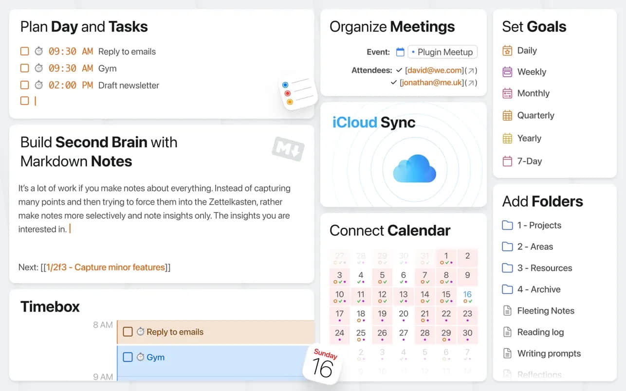 1. 每日任务规划:自动创建每日笔记,整合日历事件、任务列表和笔记,支持拖拽调整和快速Markdown输入。