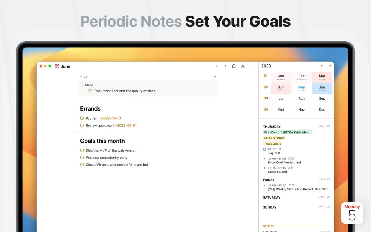 2. 长期项目管理:提供周、月和年视图笔记,便于跟踪承诺和组织项目,使用标签和提及增强搜索性。