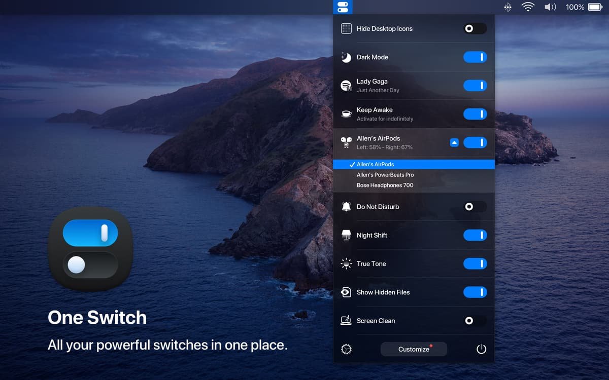 One Switch for Mac 于2019年3月正式发布初版聚焦核心切换功能如隐藏桌面和暗黑模式。随后开发者不断迭代2020年加入Setapp订阅平台扩展用户基础。随macOS更新应用持续优化兼容性添加新开关如AirPods连接和Night Shift模式。到2025年版本已达1.35系列性能更稳定功能更丰富成为Mac生态中不可或缺的效率助手。