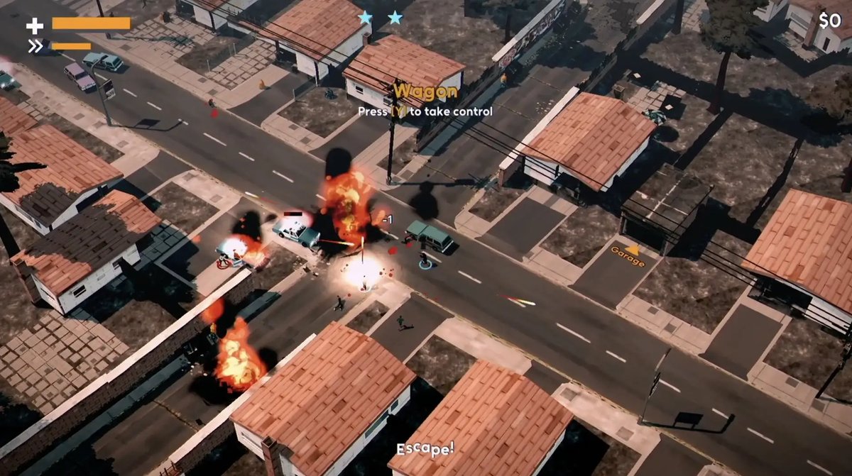 2. 双摇杆射击战斗:使用武器摧毁环境和敌人,应对警方围堵,车辆损坏后可继续步行逃脱。
