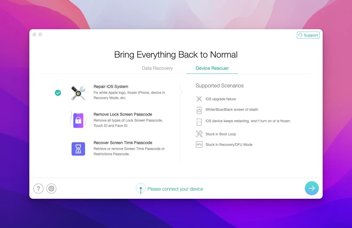 2. 系统修复工具:修复iOS崩溃、白屏或黑屏问题,而不丢失数据,提供标准和高级模式选择。