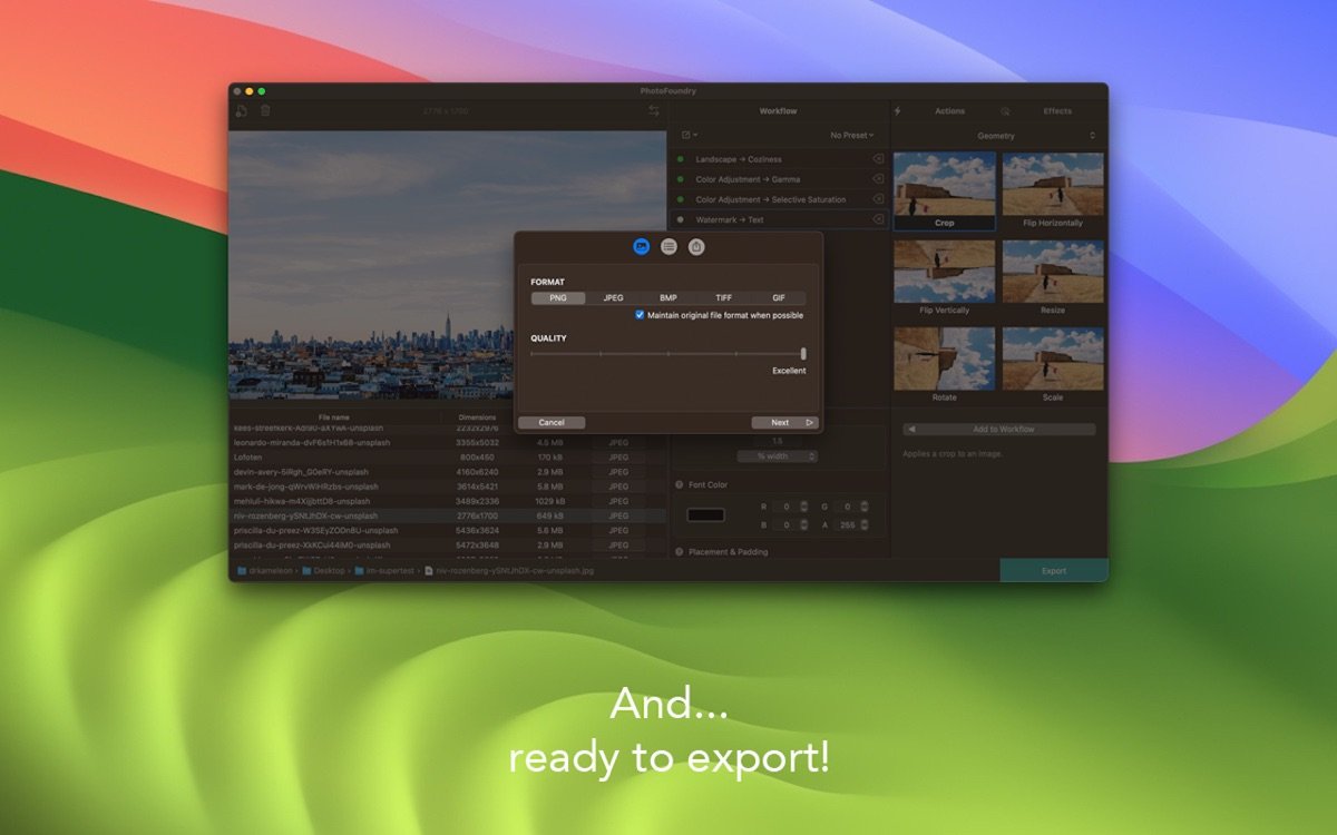 PhotoFoundry for Mac 是一款专为Mac平台设计的专业批量照片编辑工具,专注于帮助用户快速高效地处理大量图像。它以Mac原生的速度和优雅界面为核心优势,让摄影爱好者、专业设计师或日常用户都能轻松完成复杂编辑任务。无论是添加艺术滤镜、调整色彩平衡、批量更改尺寸还是插入个性化水印,软件都提供高度可配置的操作选项,同时支持实时预览功能,确保每一步修改都能即时看到效果,避免反复试错。PhotoFoundry for Mac 兼容多种常见图像格式,导出过程智能且无损,极大提升了工作流程效率,成为Mac用户照片优化的首选助手。