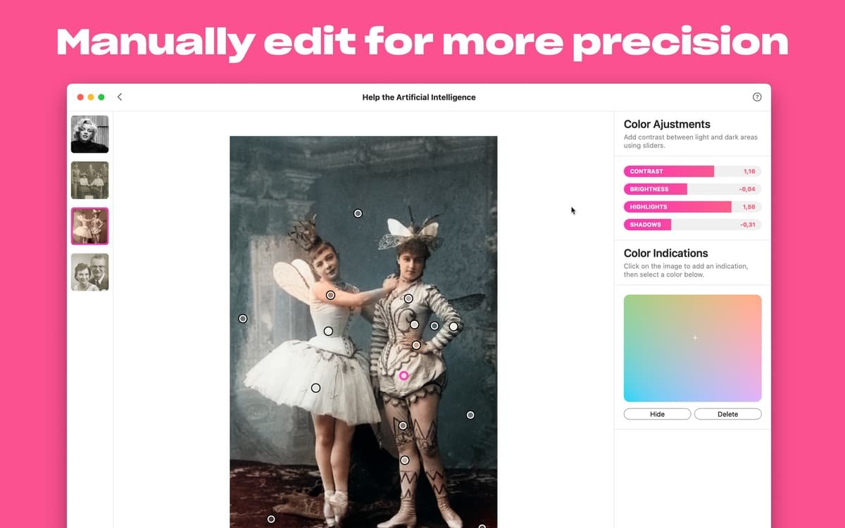 "不完美但实用,颜色选择智能,偶尔需后期触碰,但黑白照片修复效率高。"