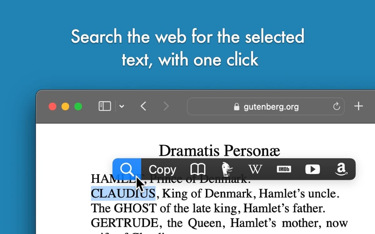 4. 智能网页搜索:直接用选中内容查询 Google、Bing 或 Wikipedia,甚至 Amazon 和 YouTube,加速信息获取。