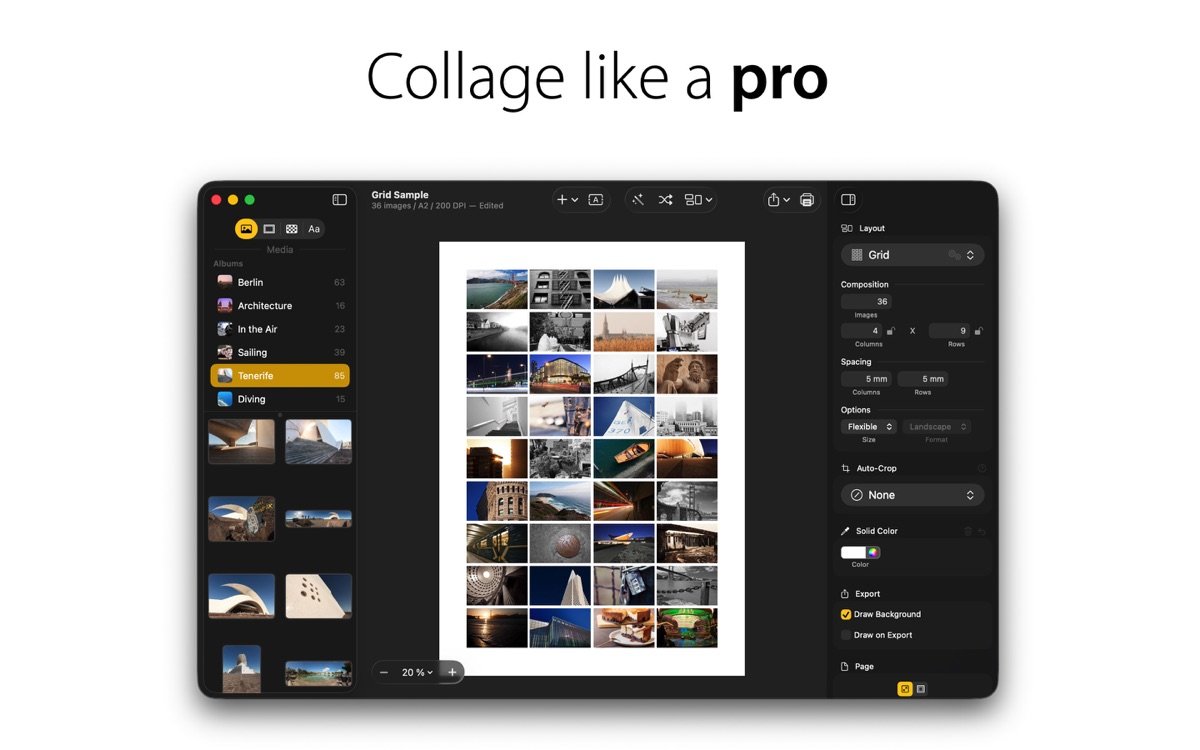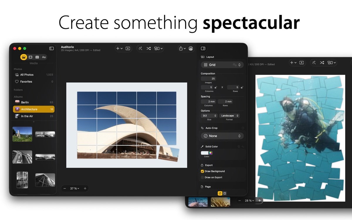 "灵活处理从1到1000张图片,适合海报到明信片各种尺寸。"