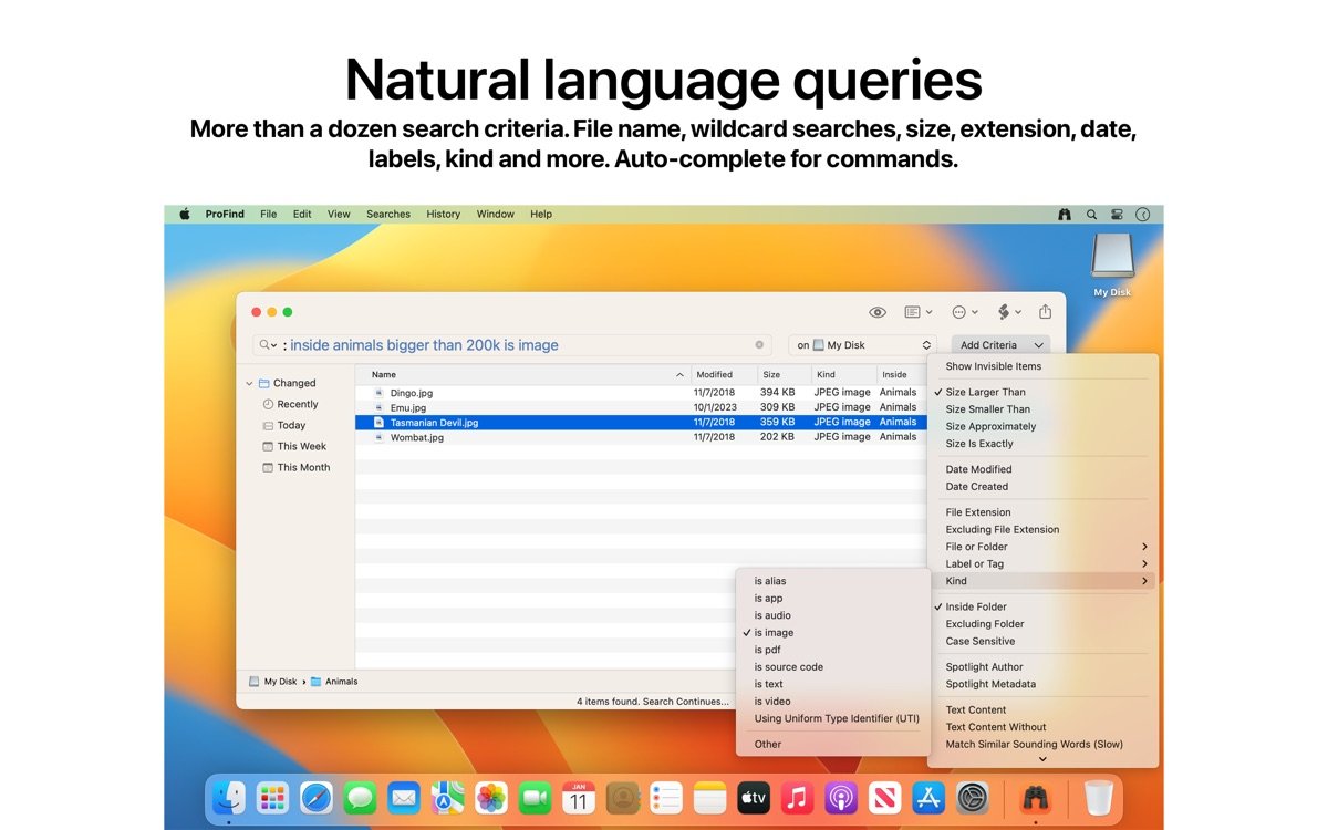 ProFind for Mac 是一款专为macOS设计的强大文件搜索工具,它超越了传统Spotlight的功能,提供更快速、更全面的搜索体验。用户可以通过自然语言输入查询,如“昨天修改的PDF文件”,快速定位任何磁盘上的文件和文件夹。ProFind 支持多种搜索条件,包括文件名、创建日期、修改日期、文件扩展名、标签、正则表达式、通配符和Spotlight元数据,还能排除特定词语,确保搜索结果精准高效。此外,它内置了脚本支持、快速预览和拖拽操作,适用于个人用户和专业人士的文件管理需求。无论是本地磁盘、网络服务器还是外部存储,ProFind 都能轻松处理,帮助用户节省时间,提高工作效率。作为一款独立开发的应用程序,ProFind 注重隐私保护,不收集用户数据,并兼容Dark Mode,提供可自定义的热键和菜单栏图标,让文件搜索变得简单直观。