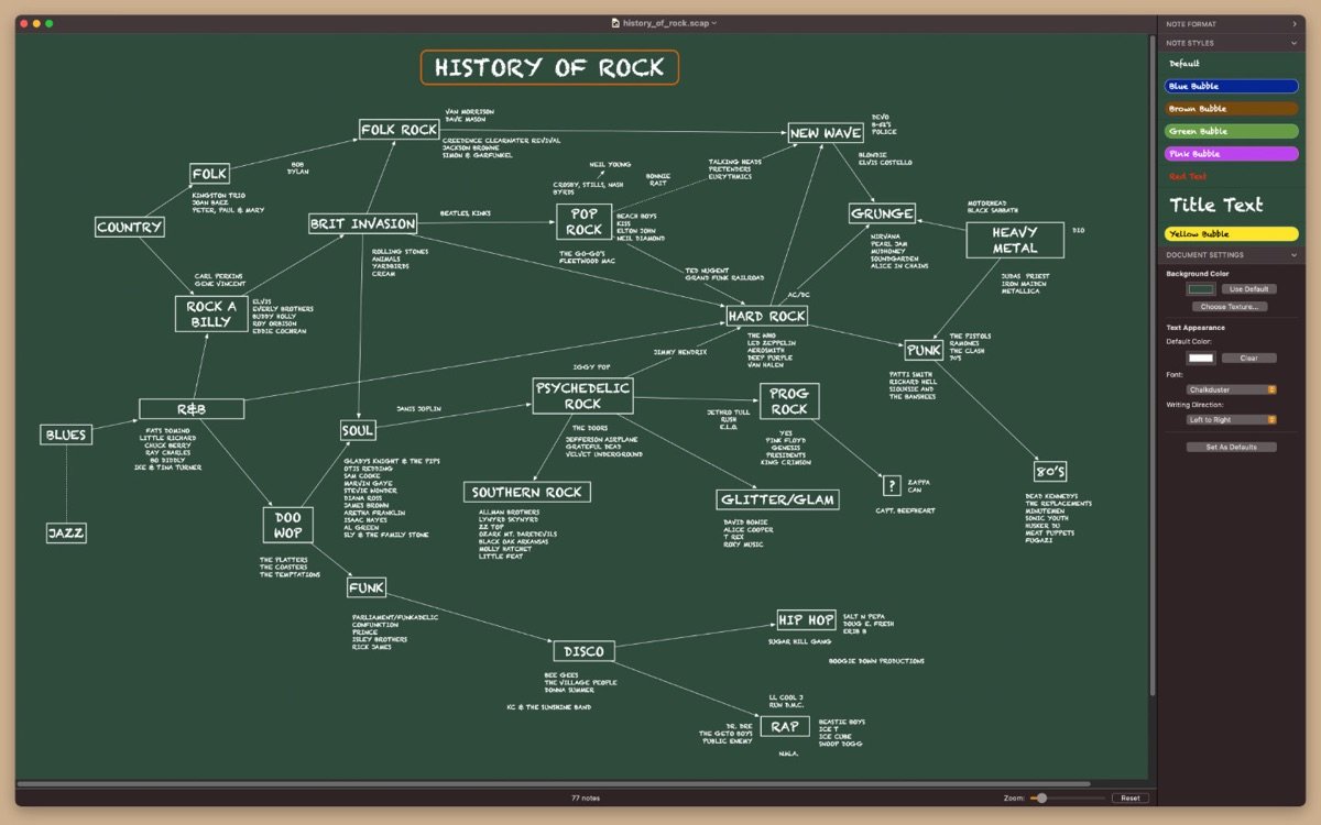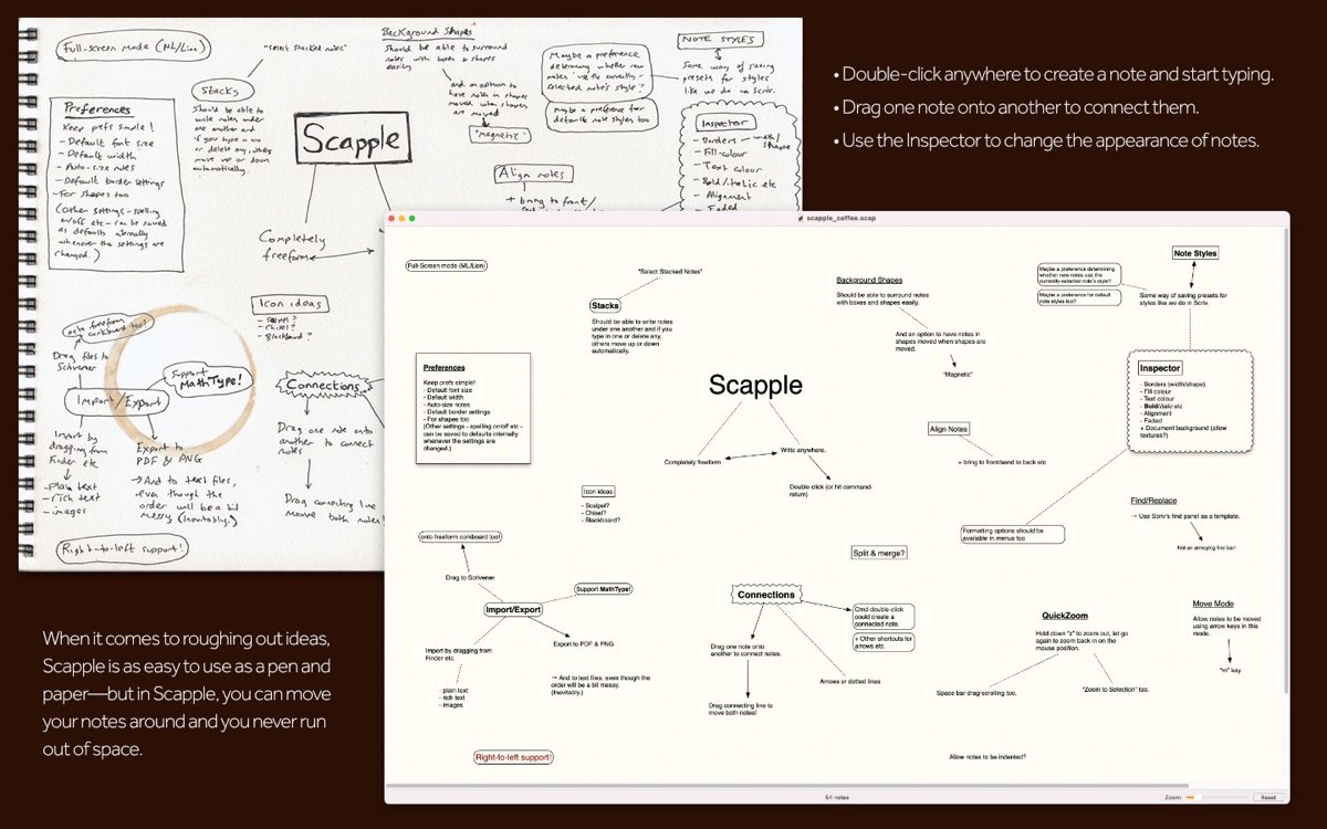"Scapple很棒,一旦设置好笔记样式,就值回票价,我用它脑暴和替换Scrivener的角色模板。"