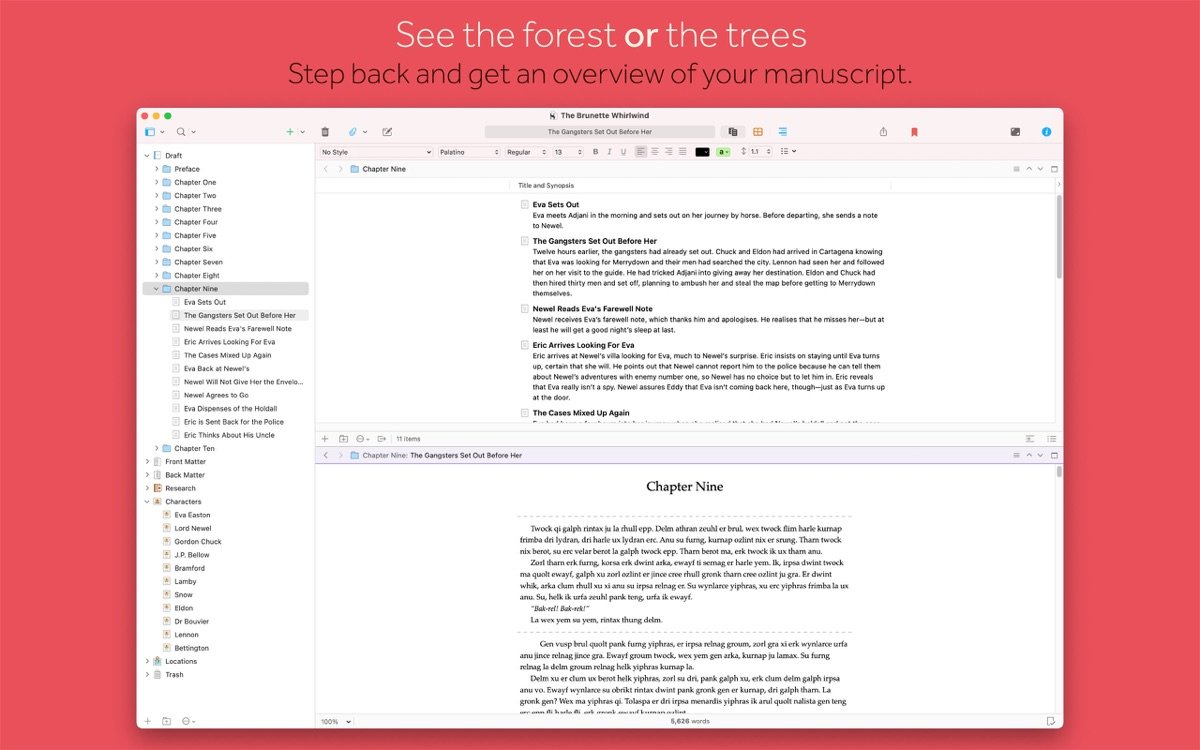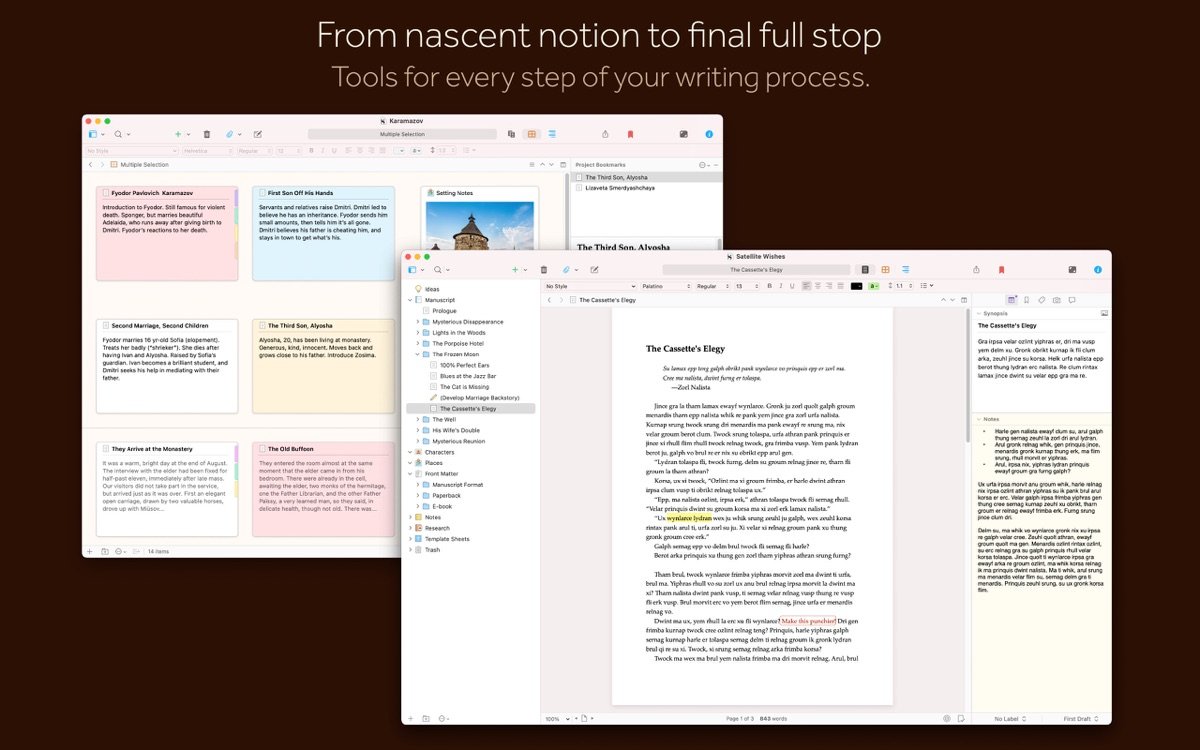 3. 规划工具:内置软木板和大纲视图,使用虚拟索引卡规划情节,添加元数据如标签和状态跟踪进度。