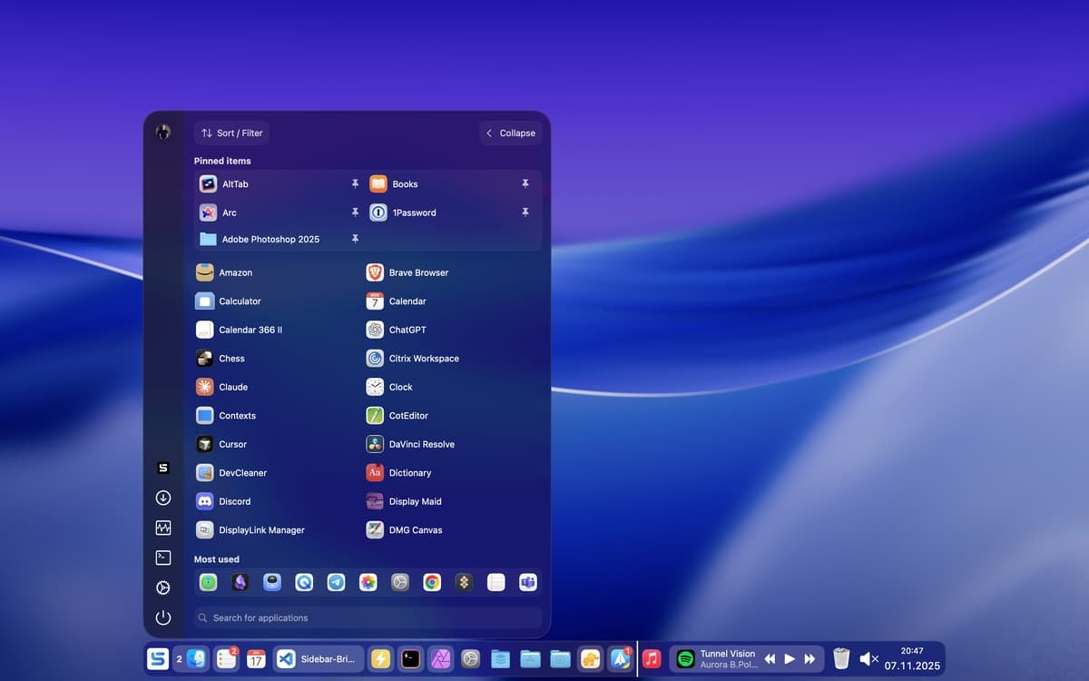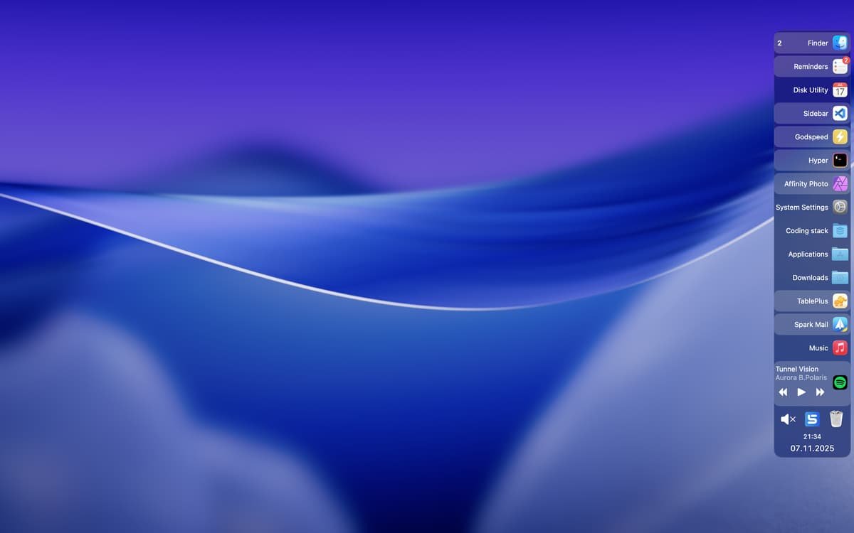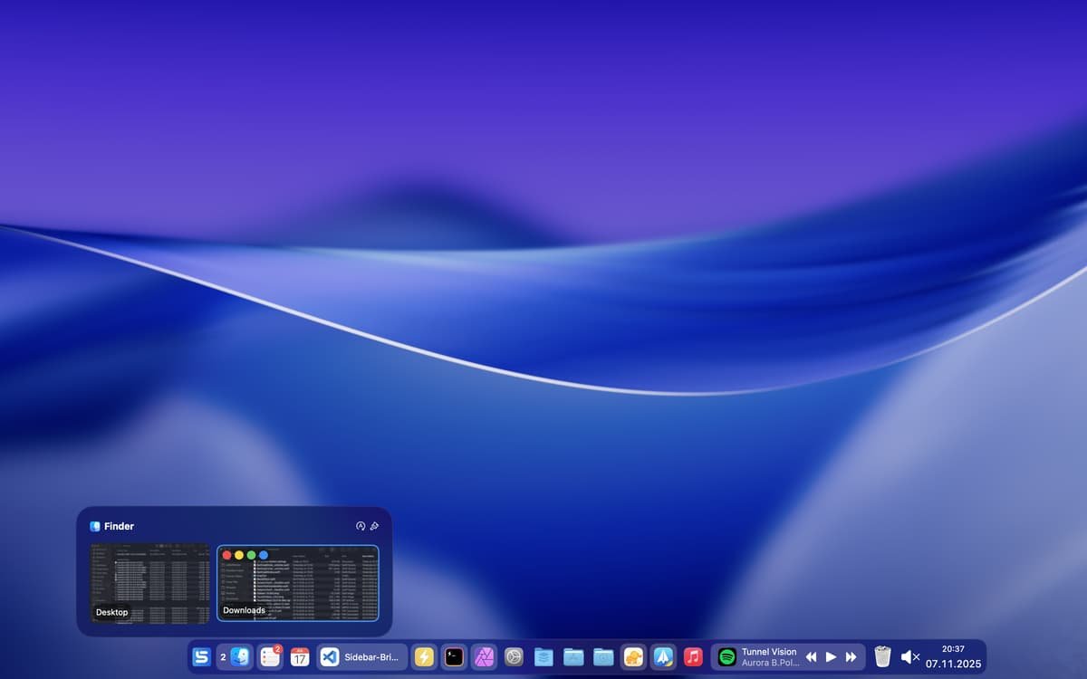 - 新增 Workspaces:支持工作区,可保存 Sidebar 的各项配置(如固定应用、堆叠、样式等),支持手动切换及通过 URL scheme 或 macOS Shortcuts 自动化切换。