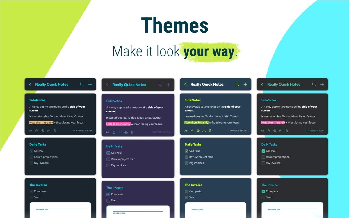 SideNotes for Mac是一款专为macOS设计的快速笔记应用,它巧妙地隐藏在屏幕边缘,通过简单手势或快捷键即可滑动出现,让用户在不切换应用的情况下即时捕捉任务、想法、链接或代码片段。支持iCloud同步,确保笔记在多设备间无缝流动;内置Markdown格式化,让笔记更具结构化;提供多种主题和自定义选项,适应不同用户偏好;笔记颜色分类、图像插入、文件快捷方式等功能,进一步增强笔记管理的灵活性。无论是日常提醒、会议记录还是编程片段,SideNotes都能帮助用户保持专注,提升生产力。