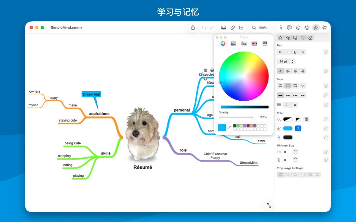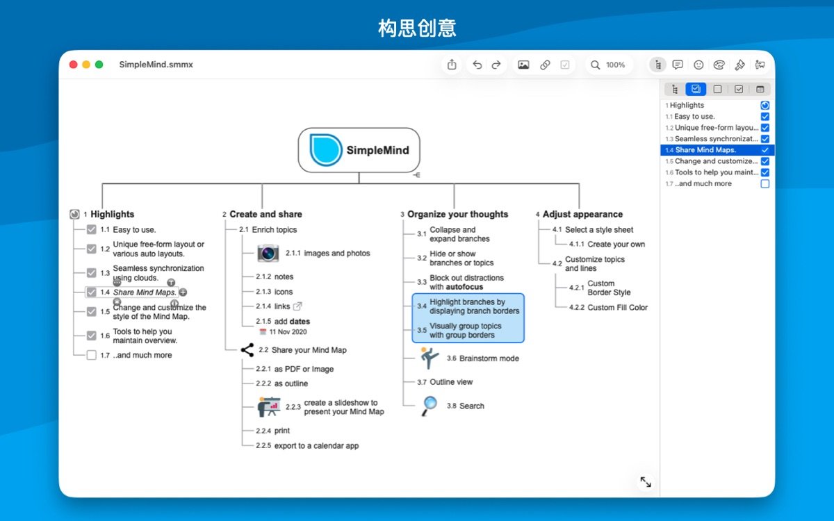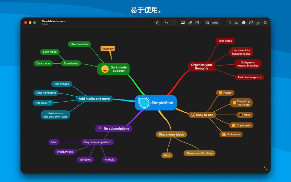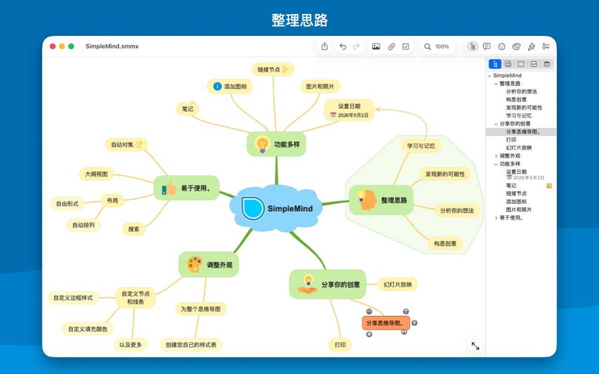 SimpleMind for Mac 是一款领先的思维导图工具,专为 Mac 用户设计,帮助您将复杂想法转化为清晰的视觉结构。通过直观的界面,用户可以自由放置主题、使用自动布局进行头脑风暴,并添加颜色、图像和笔记来丰富内容。这款软件适用于商业、教育、法律和医疗等领域,支持无限页面大小和元素数量,确保您的创意不受限制。无论是在工作中规划项目,还是在学习中整理知识,SimpleMind 都能提供可靠的支持,已有超过15年的持续更新历史,深受全球用户信赖。