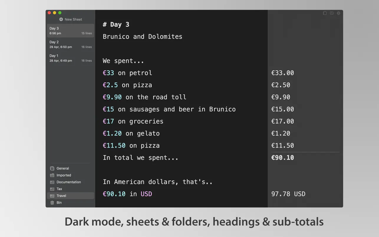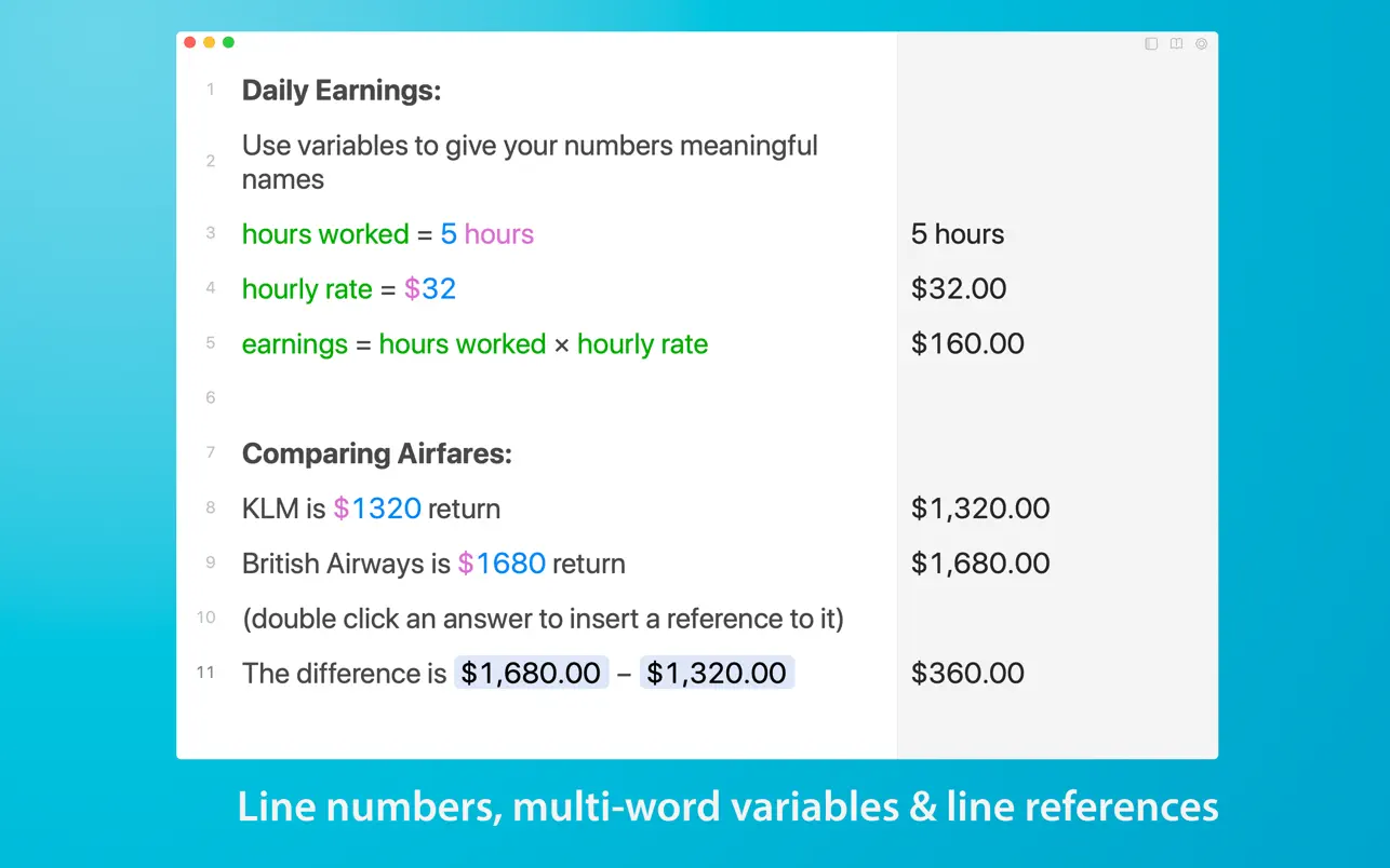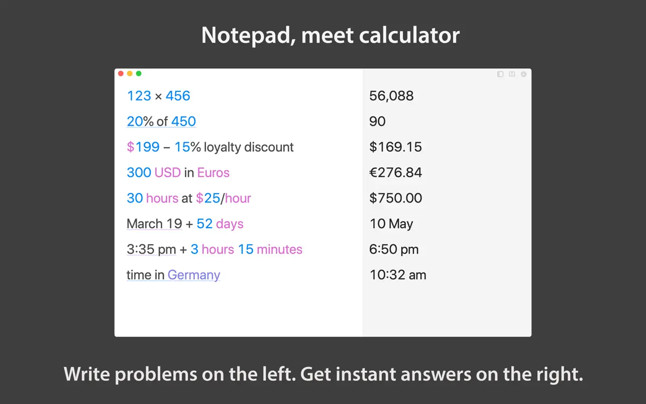 Soulver 3 for Mac 是一款创新的记事本计算器应用,它将传统计算器与文本编辑器完美结合,支持自然语言输入,让用户通过简单文字描述即可完成复杂计算。无论是预算规划、单位转换还是日期差计算,这款软件都能即时显示结果,并自动保存所有操作记录。Soulver 3 for Mac 适用于财务人员、工程师、学生和日常用户,提供自定义变量、实时汇率和股票报价等功能,确保计算过程高效而直观。作为Mac计算工具的佼佼者,它兼容Dark Mode,并通过Spotlight和Automator无缝集成macOS系统,帮助用户在记事本中轻松处理数学问题,提升计算工具的使用体验。