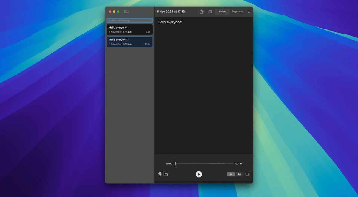 4. 多设备录音支持:兼容内置麦克风、AirPods 等设备,允许实时切换录制源,并导出为多种格式,便于集成到 Notes 或 Messages 等应用。