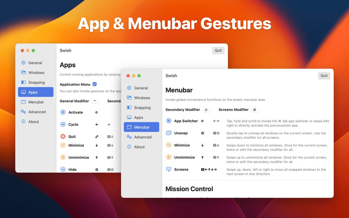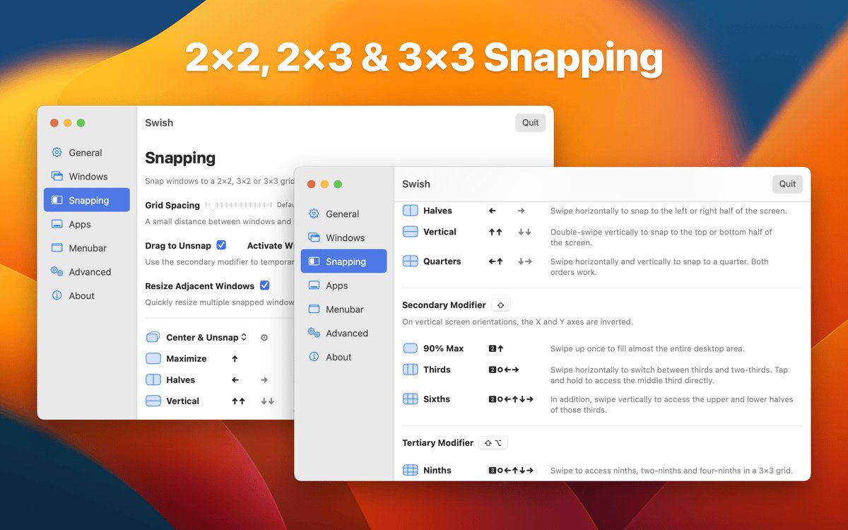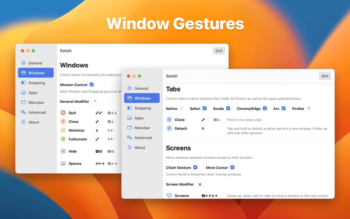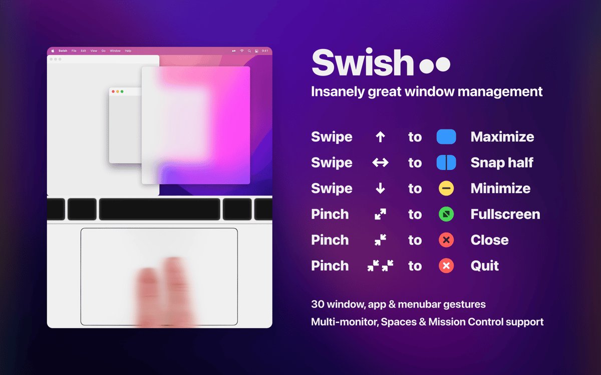 Swish for Mac 是一款革命性的窗口管理工具,专为Mac用户设计,通过触控板手势实现高效操作。无论您是多任务处理者还是追求简洁桌面的专业人士,Swish 都能让您的Mac体验更流畅。它支持Magic Trackpad和Magic Mouse,提供30多种直观手势,帮助您轻松调整窗口大小、位置和状态。Swish 完美兼容多显示器设置,让窗口在屏幕间无缝移动,同时保持macOS原生美观。无需复杂设置,Swish 即可融入日常工作流,显著提高生产力,让窗口管理变得像魔法一样简单。
