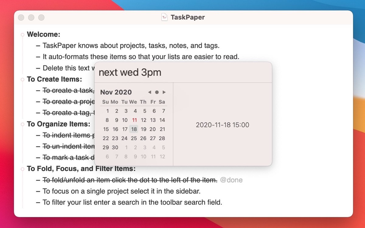 TaskPaper for Mac 是一款专注于纯文本待办事项管理的出色应用,它将简单文本编辑器与强大大纲功能完美结合,让用户在键盘友好环境中快速创建和组织任务列表。无论处理日常琐事还是复杂项目,TaskPaper 都能通过自动格式化项目任务笔记和标签,提供高效的任务管理体验。用户可以随时在任何文本编辑器中编辑文件,确保数据灵活性和兼容性。作为一款强调生产力的待办清单工具,它支持日期调度、黑暗模式和自定义主题,帮助用户专注核心工作而非繁琐界面操作。TaskPaper 适合追求简约高效的任务跟踪者,广泛应用于个人生产力和团队协作场景。