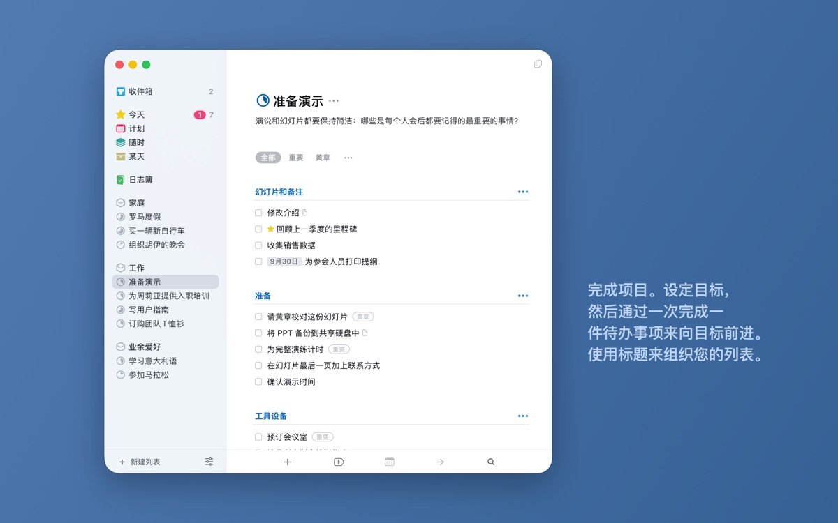 答:点击左侧栏的“新任务”按钮,或使用快捷键 Command + N,直接输入任务名称并设置标签或截止日期。