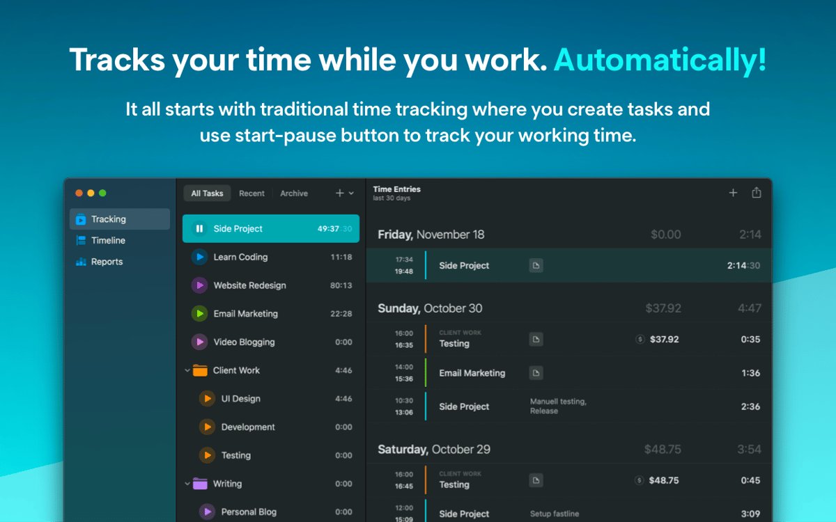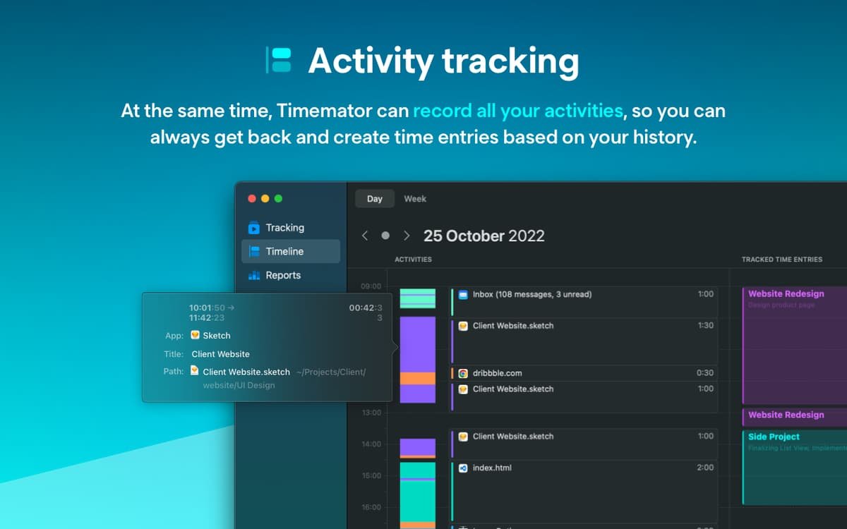 Timemator for Mac是一款专为Mac用户设计的智能时间跟踪应用,它能自动捕捉您在电脑上的每一次活动,包括打开的应用、编辑的文件和浏览的网站,从而无需手动启动计时器即可记录精确工时。这款工具特别适合自由职业者、设计师和开发者,帮助他们组织项目任务、计算账单收入,并通过直观的活动时间线回顾工作流程。无论您是需要跟踪多个客户项目还是优化日常生产力,Timemator都能无缝集成到您的Mac环境中,提供离线工作支持和隐私保护,确保数据始终安全存储在本地设备上。