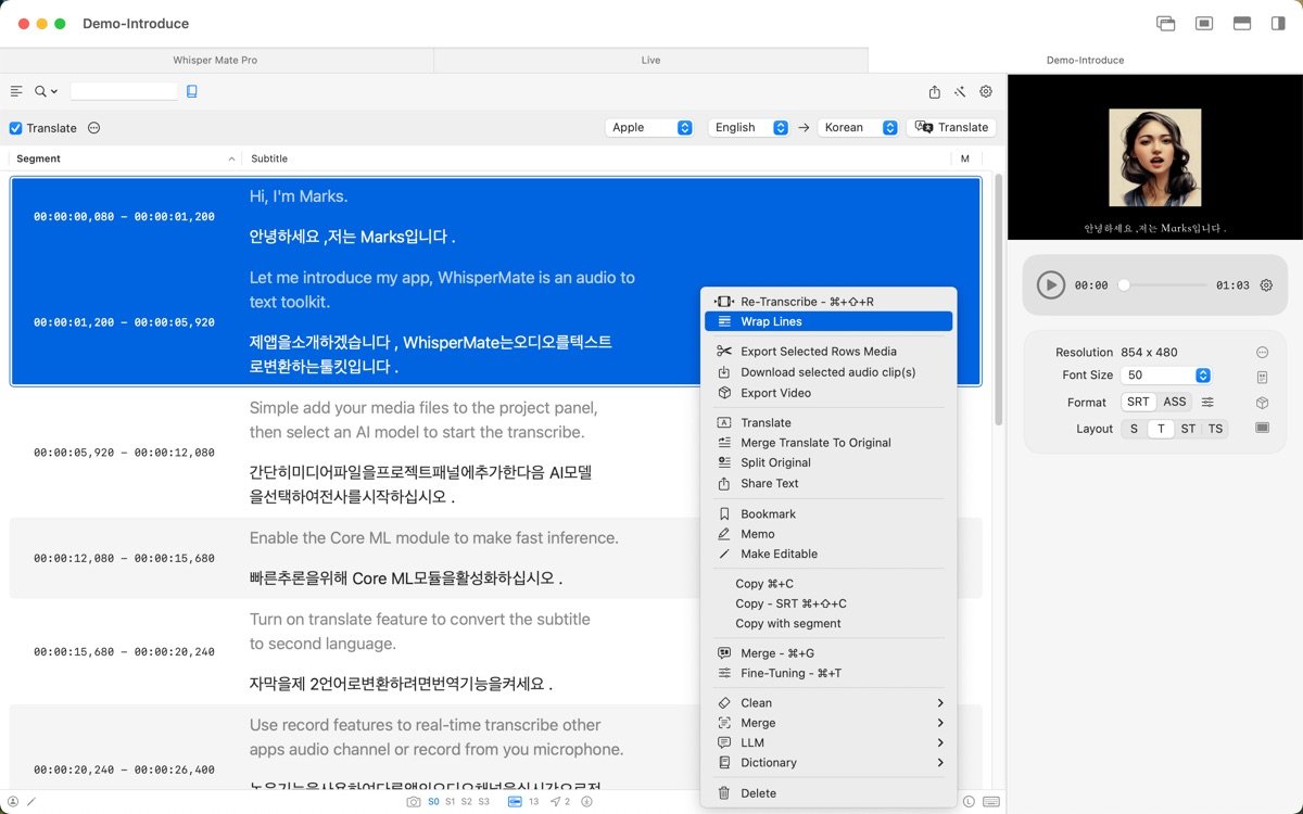 3. 字幕编辑与翻译:内置编辑器允许合并行、调整时段,使用DeepL或系统翻译引擎批量转换字幕,支持SRT、VTT等格式导出。