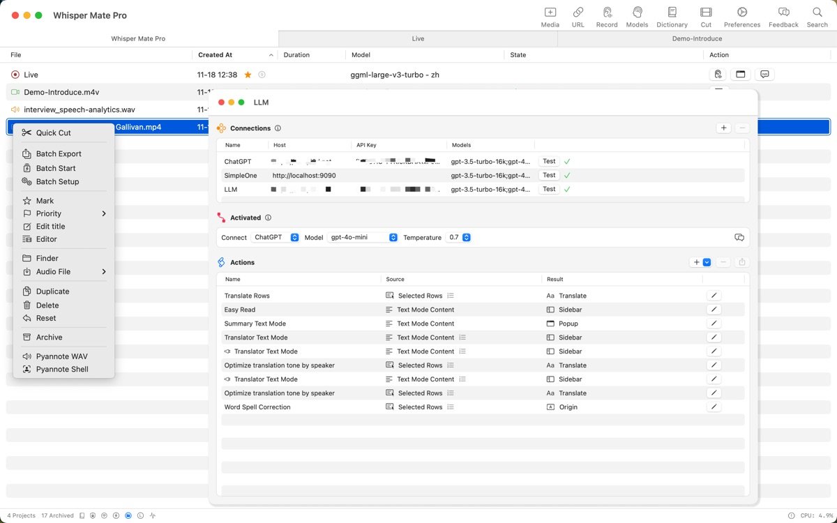 Whisper Mate for Mac 自推出以来,不断迭代优化,从最初的基本转录功能逐步扩展到多引擎支持与高级编辑。自V1.0版本引入核心Whisper模型与DeepL翻译以来,开发团队持续响应用户反馈,V2.0添加应用音频捕获,V3.0实现实时麦克风转录。进入V5.0后,引入说话者识别与批量操作,V6.0集成LLM模型与自定义模型支持,提升Apple Silicon兼容性。V7.0新增WhisperKit引擎,V9.0系列则聚焦macOS 15+优化,如内置AI转录与双语同时处理。到9.9.8版本,已成为macOS生态中转录领域的领先工具,累计数百万次下载,深受内容创作者青睐。