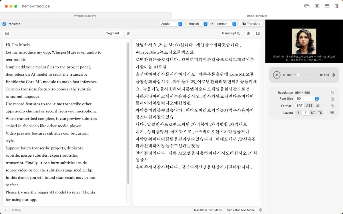 Whisper Mate for Mac 是一款专为macOS设计的强大语音转录应用,它利用OpenAI的Whisper AI模型,将音频或视频文件批量转换为精确文本,支持本地处理以保障用户隐私。内置字幕编辑器让用户能逐段预览和优化转录结果,适用于播客制作、会议记录、视频字幕生成等多种场景。无论处理长时长媒体还是实时录音,这款工具都能提供高效流畅的体验,帮助创作者节省时间,提升内容质量。