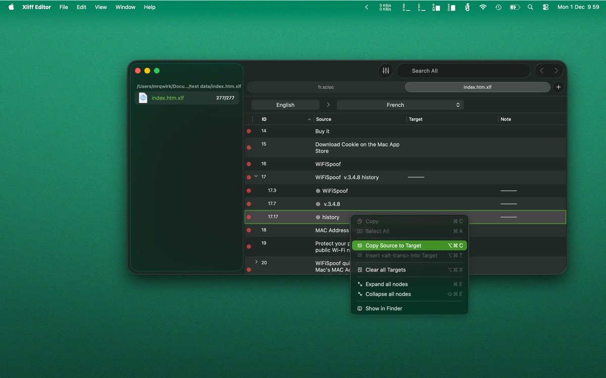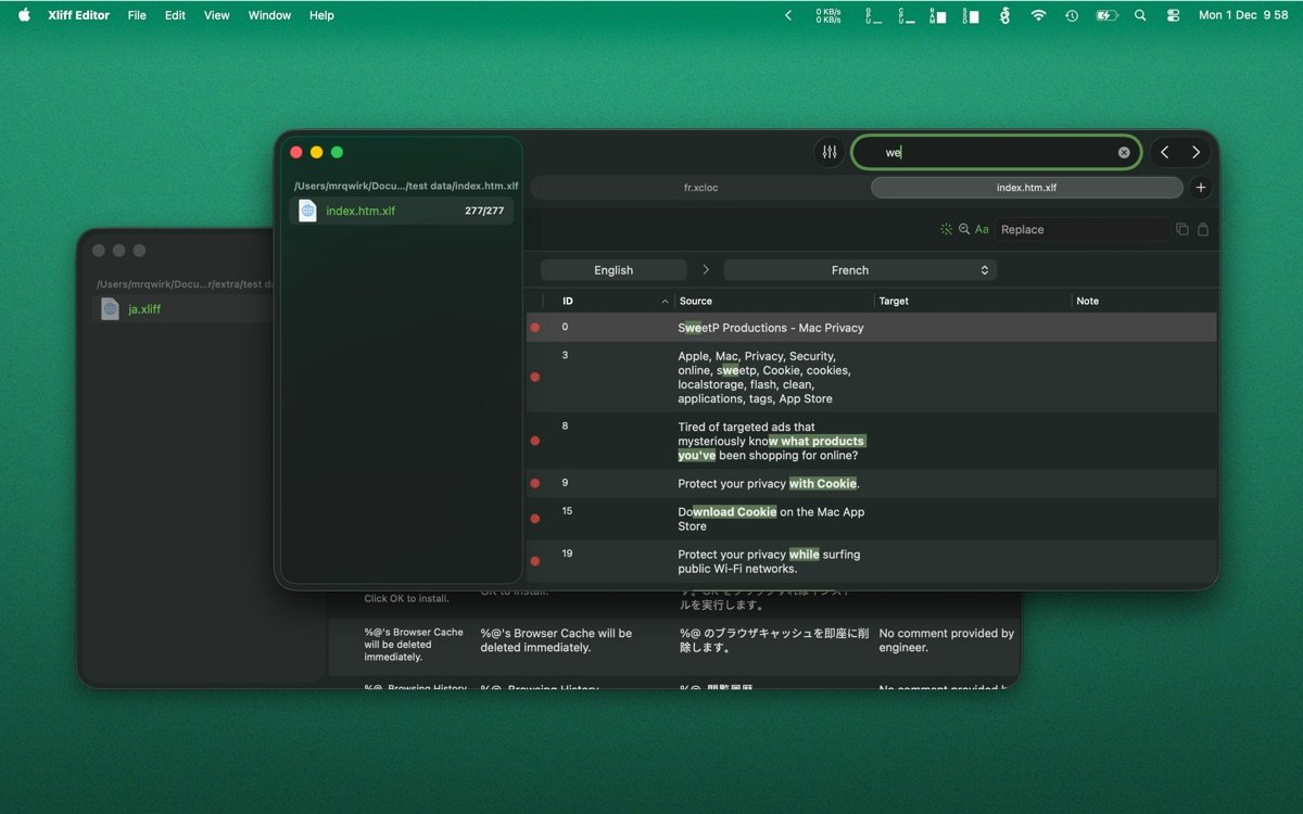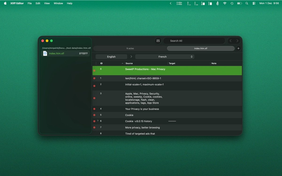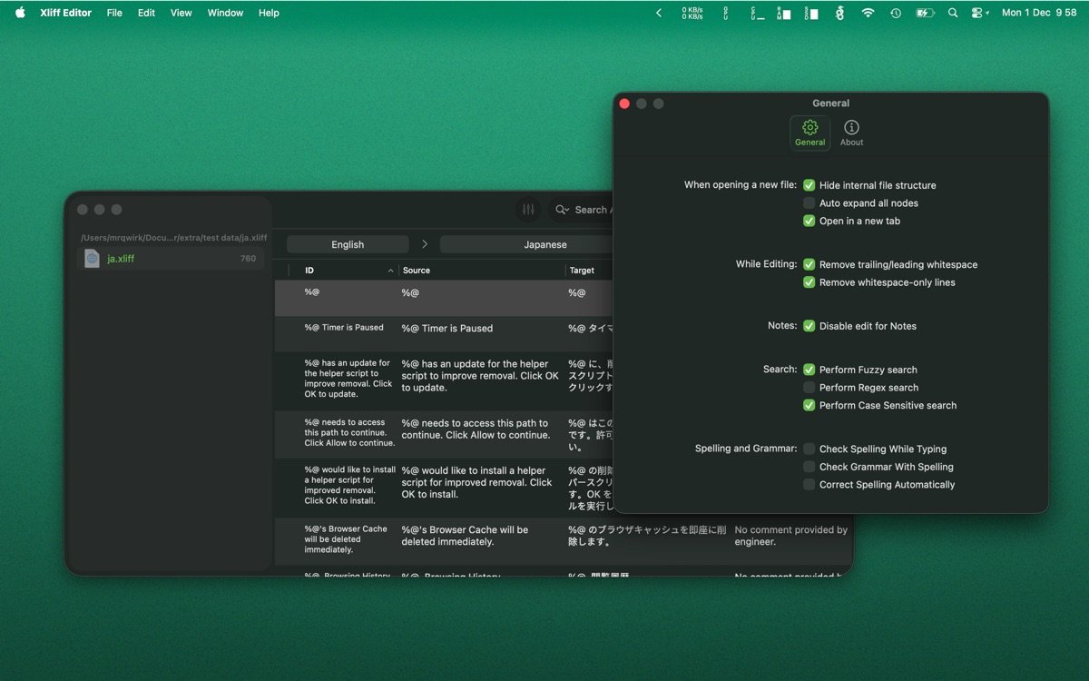 Xliff Editor for Mac 是一款专为Mac用户设计的XLIFF文件编辑器,专注于软件本地化和翻译工作。它采用原生macOS API构建,确保快速加载、低内存占用和无缝兼容,支持XLIFF v1.2格式的文件处理,包括分段、内联标签和备用翻译。通过直观的界面和强大功能,用户可以轻松编辑多语言字符串,避免XML格式的复杂操作,适用于iOS、macOS应用开发者以及翻译团队。软件还集成系统拼写检查、多文件同时编辑和模糊搜索,帮助提升工作效率,避免文件损坏风险。作为一款轻量级工具,它体积小于6MB,却提供全面的本地化支持,已被翻译成英语、德语、法语、西班牙语、瑞典语、斯洛伐克语和荷兰语等多种语言,广泛应用于全球软件开发领域。